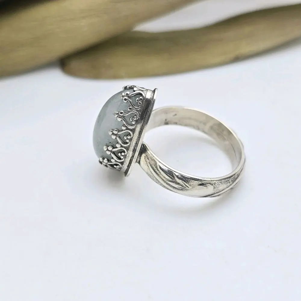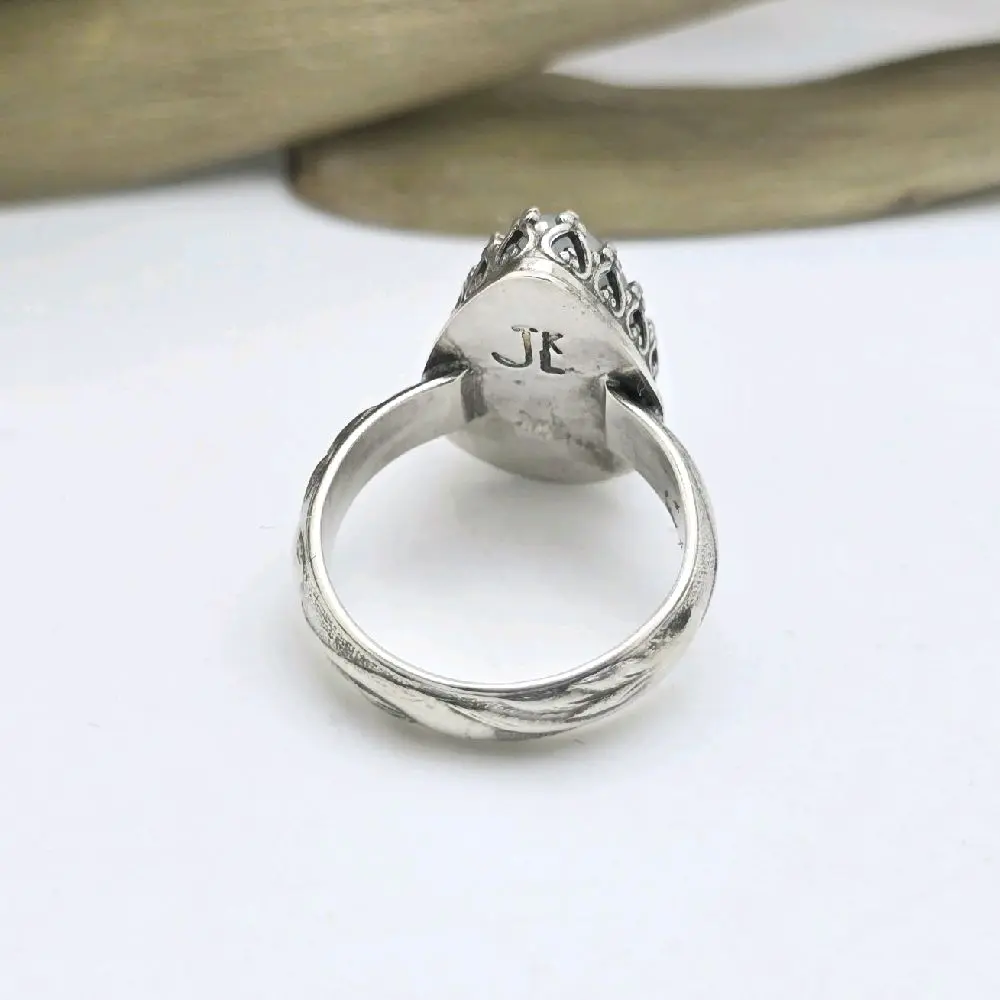 ·Set in sterling silver, it features an inverted heart gallery wire.