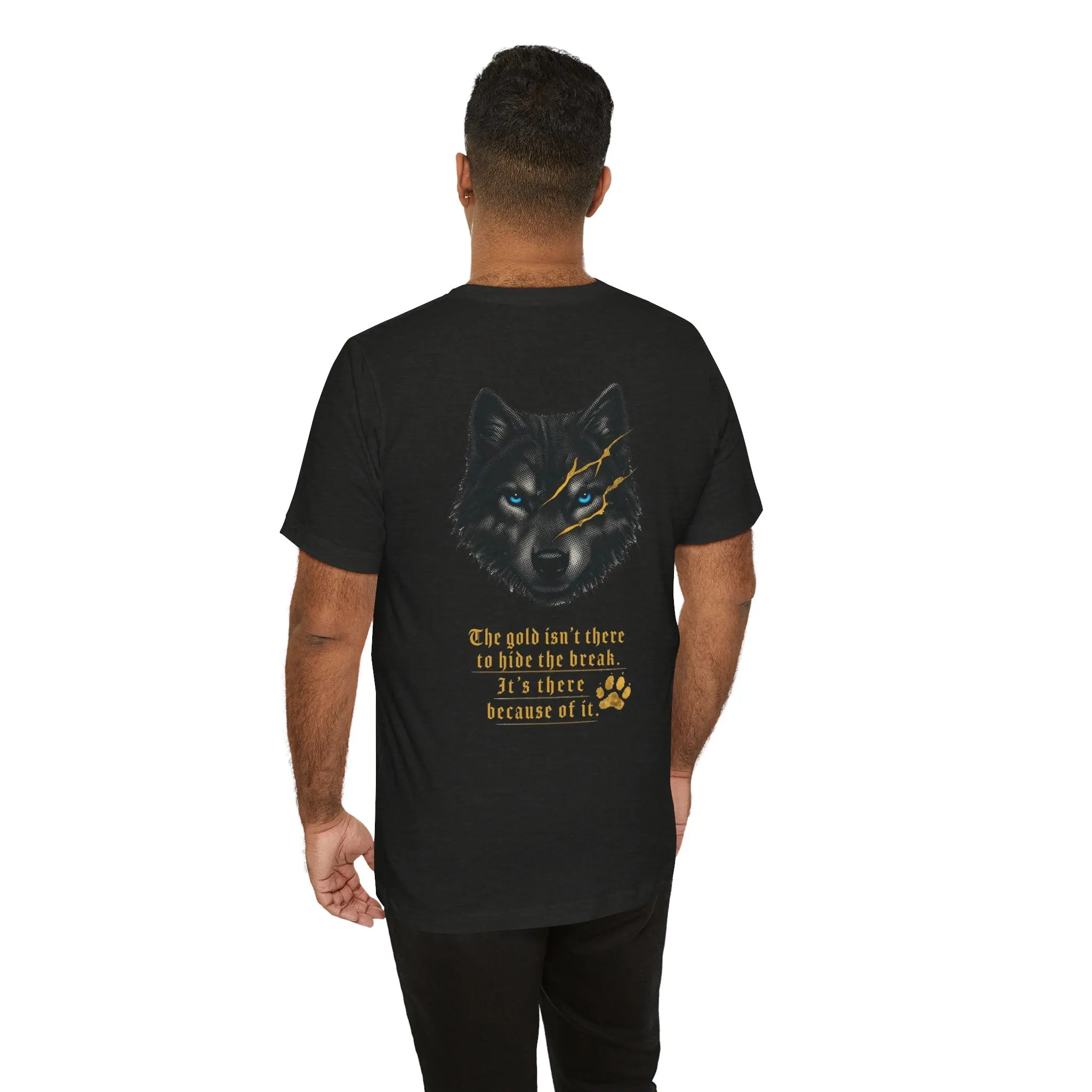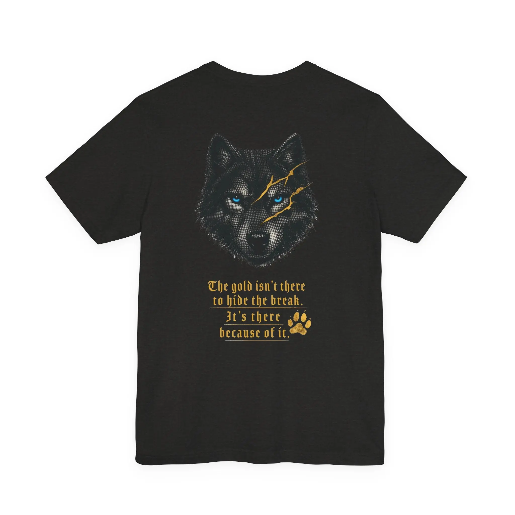 This isn't just a tee — it's a statement. Featuring our signature Reforged Wolf with piercing blue eyes and gold kintsugi cracks, this shirt is for the ones who walked through fire and came back wearing the scars like armor.
