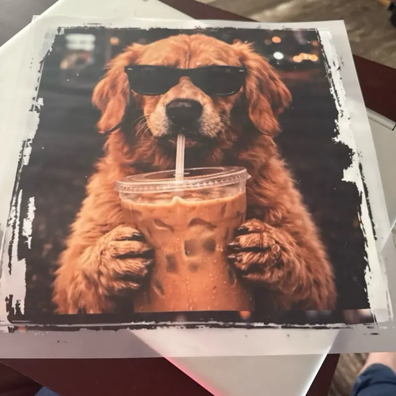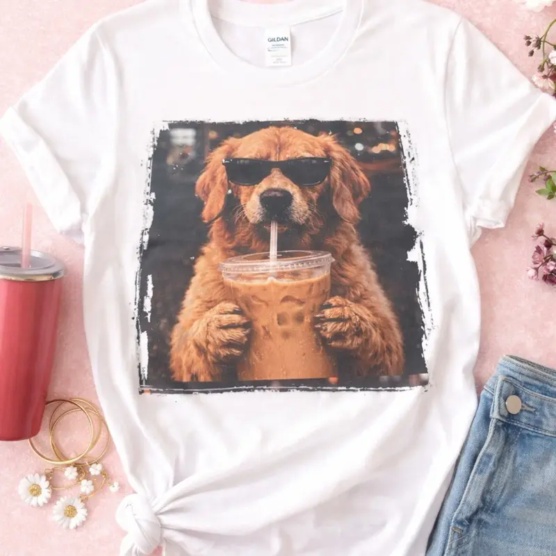 Pup and Coffee Graphic Tee - T-shirt for Womenswear, featuring a dog with sunglasses and a coffee cup, perfect for casual wear. - Top