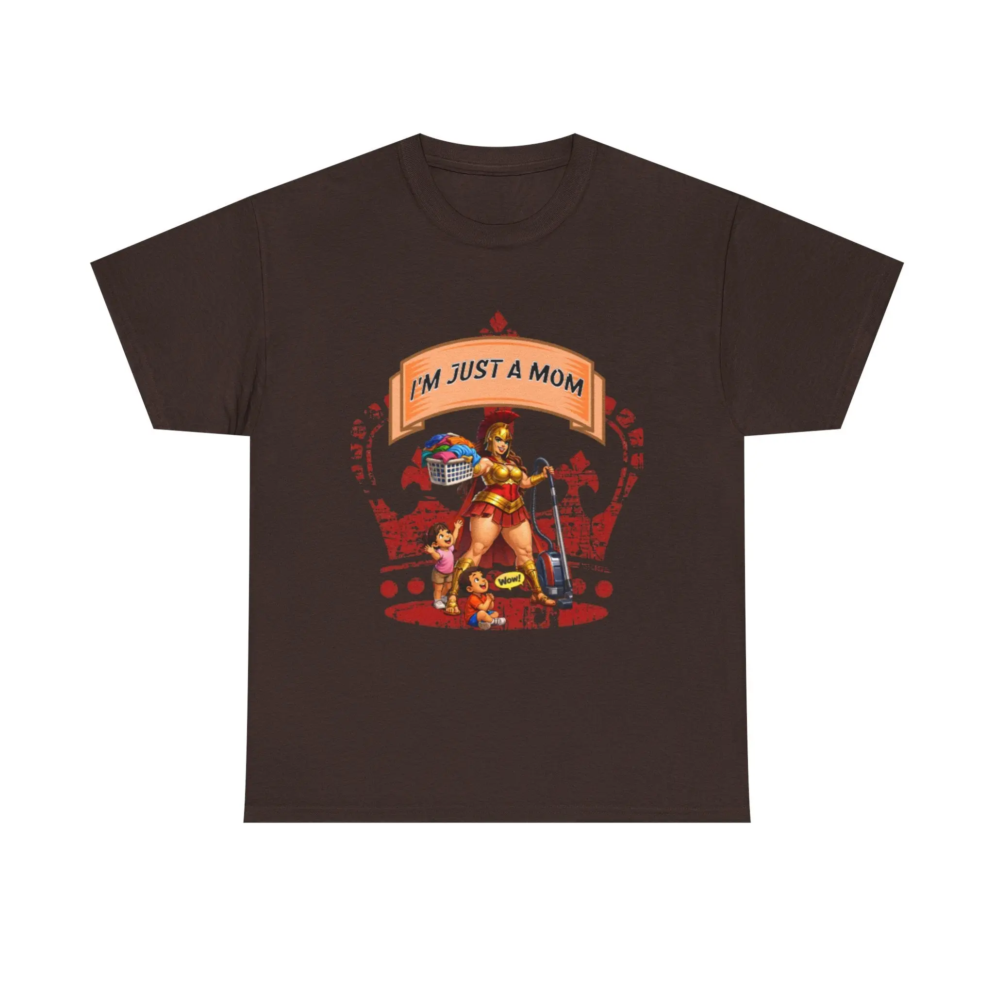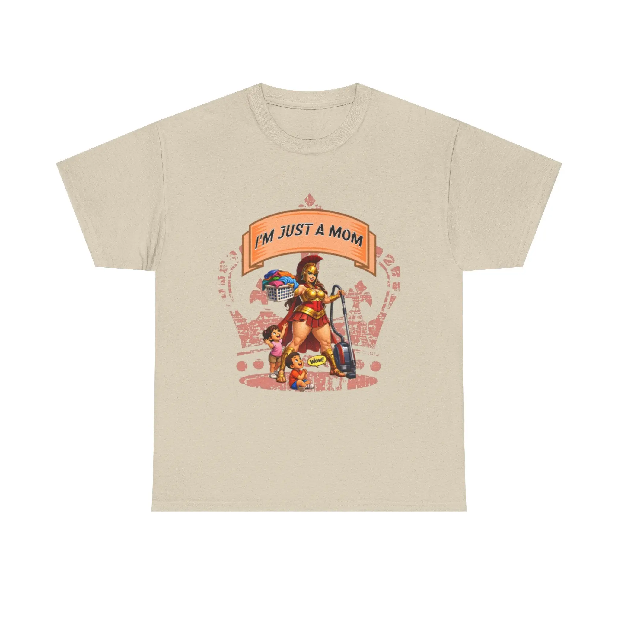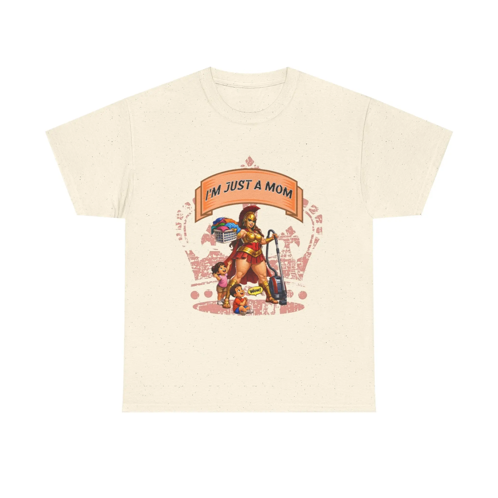 This relaxed cotton tee carries a playful, confident voice for busy moms who do it all. The bold, colorful center artwork — a strong, superhero-like mom balancing household tools, groceries, and a child — reads “I’m Just A Mom” with tongue-in-cheek pride. Soft, breathable cotton and a classic crew neckline keep it comfortable through school runs, park days, and coffee breaks. The understated white canvas lets the vibrant print pop, so the shirt reads like a wearable declaration: everyday chaos handled with humor and heart. Wear it while chasing toddlers, running errands, or lounging at home — it’s a casual staple that feels lived-in and true to the rhythm of motherhood.