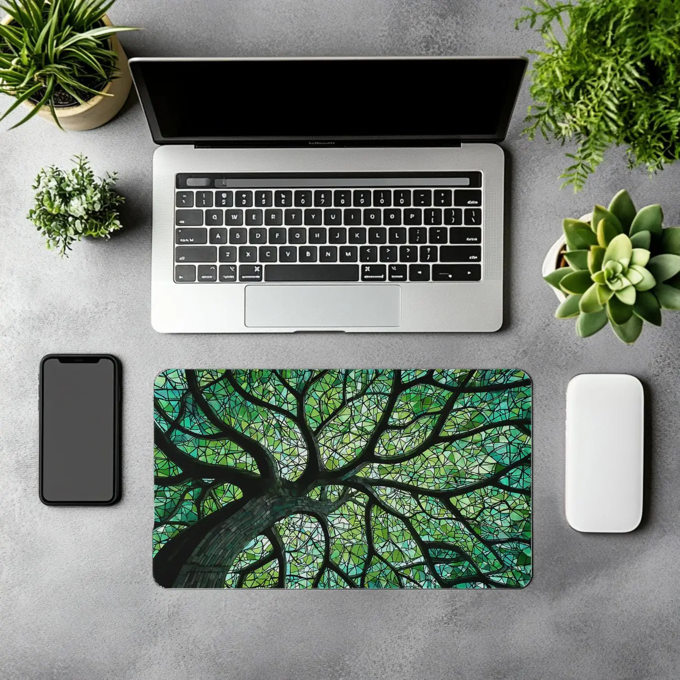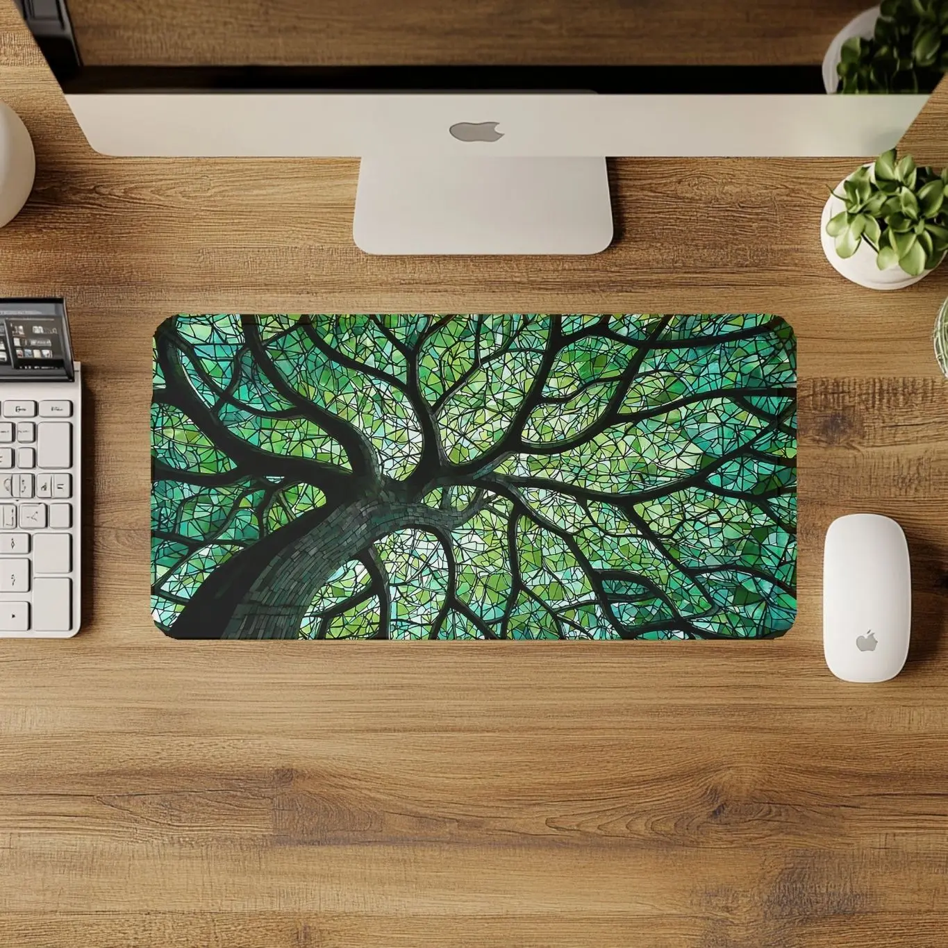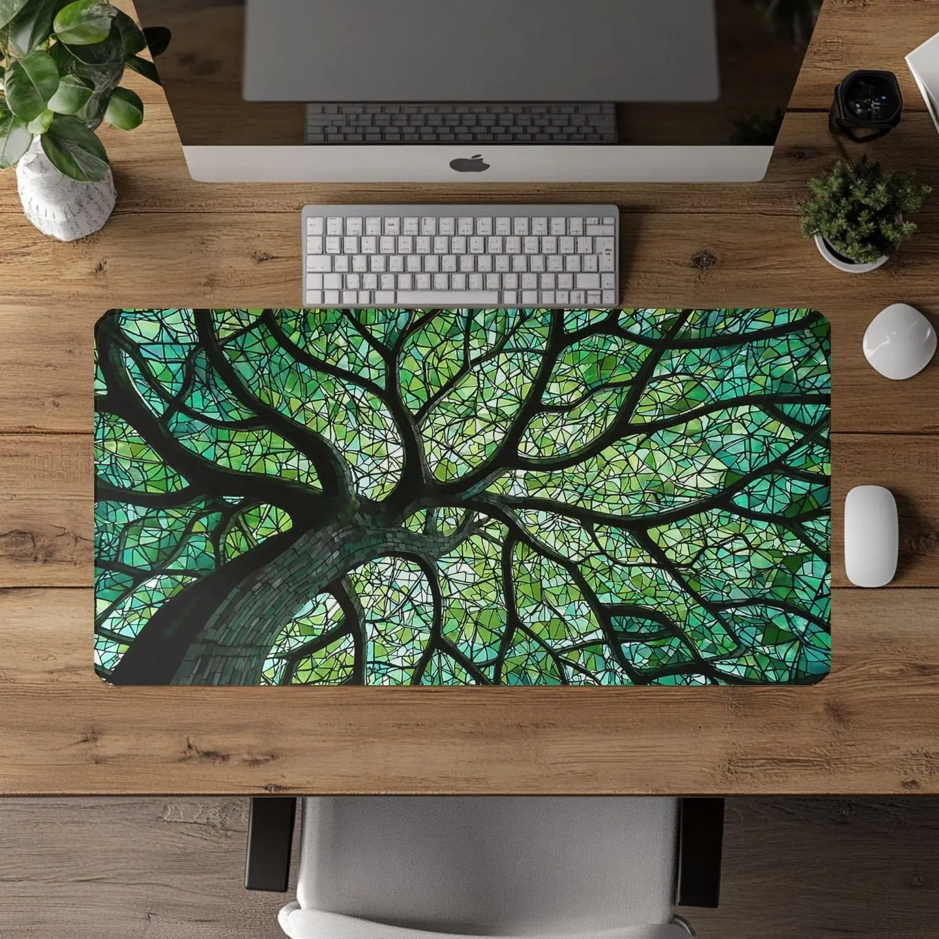 Bring vibrant color and meaningful symbolism to your workspace with our stunning green Faux Stained Glass Tree of Life Desk Mat. This beautiful design features a glowing Tree of Life surrounded by vibrant stained glass-style panels in rich shades of green, creating a peaceful and eye-catching centerpiece for your desk.