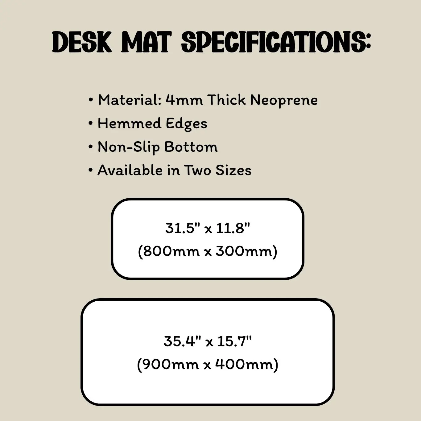 - Two sizes: 31.5" x 11.8" (800mm x 300mm) or 35.4" x 15.7" (900mm x 400mm)