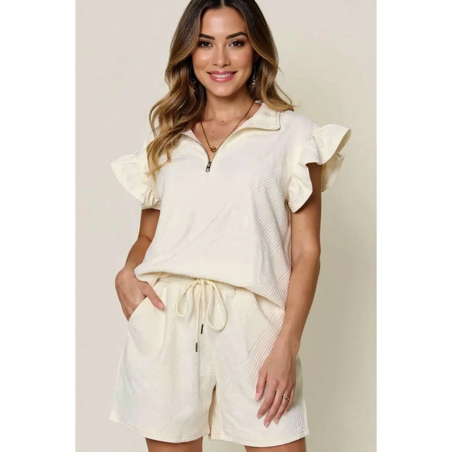 Double Take Full Size Texture Flounce Sleeve Top and Drawstring Shorts Set