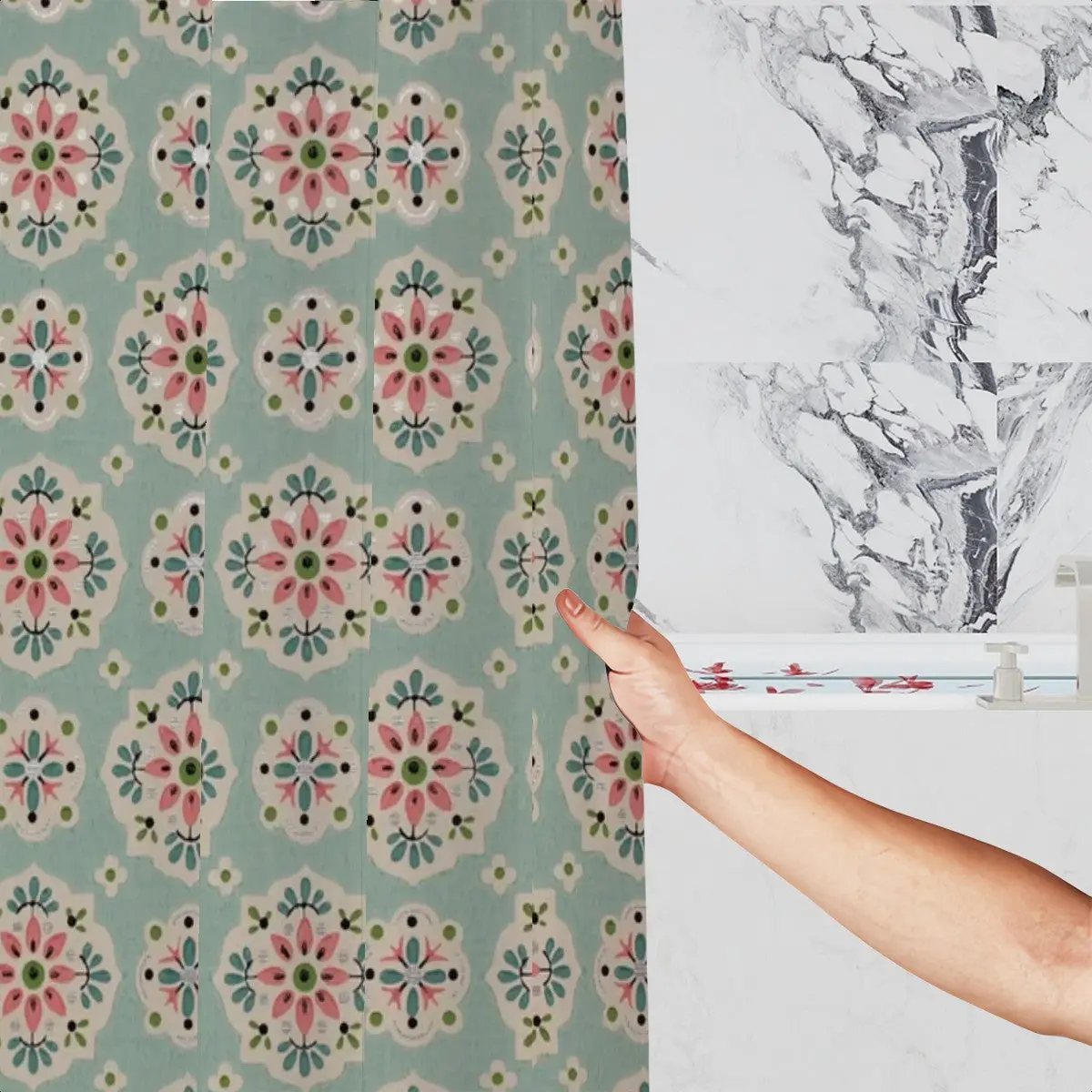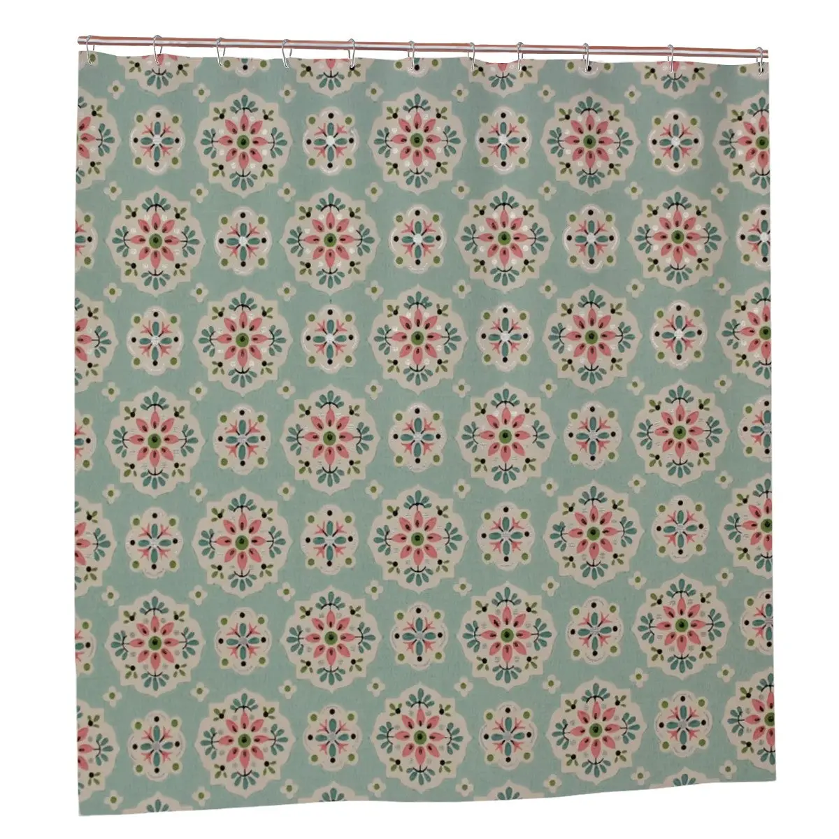 Wrap your bathroom in a soft, vintage-inspired bloom. This polyester shower curtain carries a faded floral medallion pattern in muted teal, rose, and cream — like a cherished fabric rediscovered in a seaside cottage. The lightweight drape moves gently with the breeze from an open window and dries quickly after use, keeping the space feeling fresh. Hang it with standard hooks through the reinforced top buttonholes and let the gentle, nostalgic palette calm the morning rush or slow a quiet evening ritual.