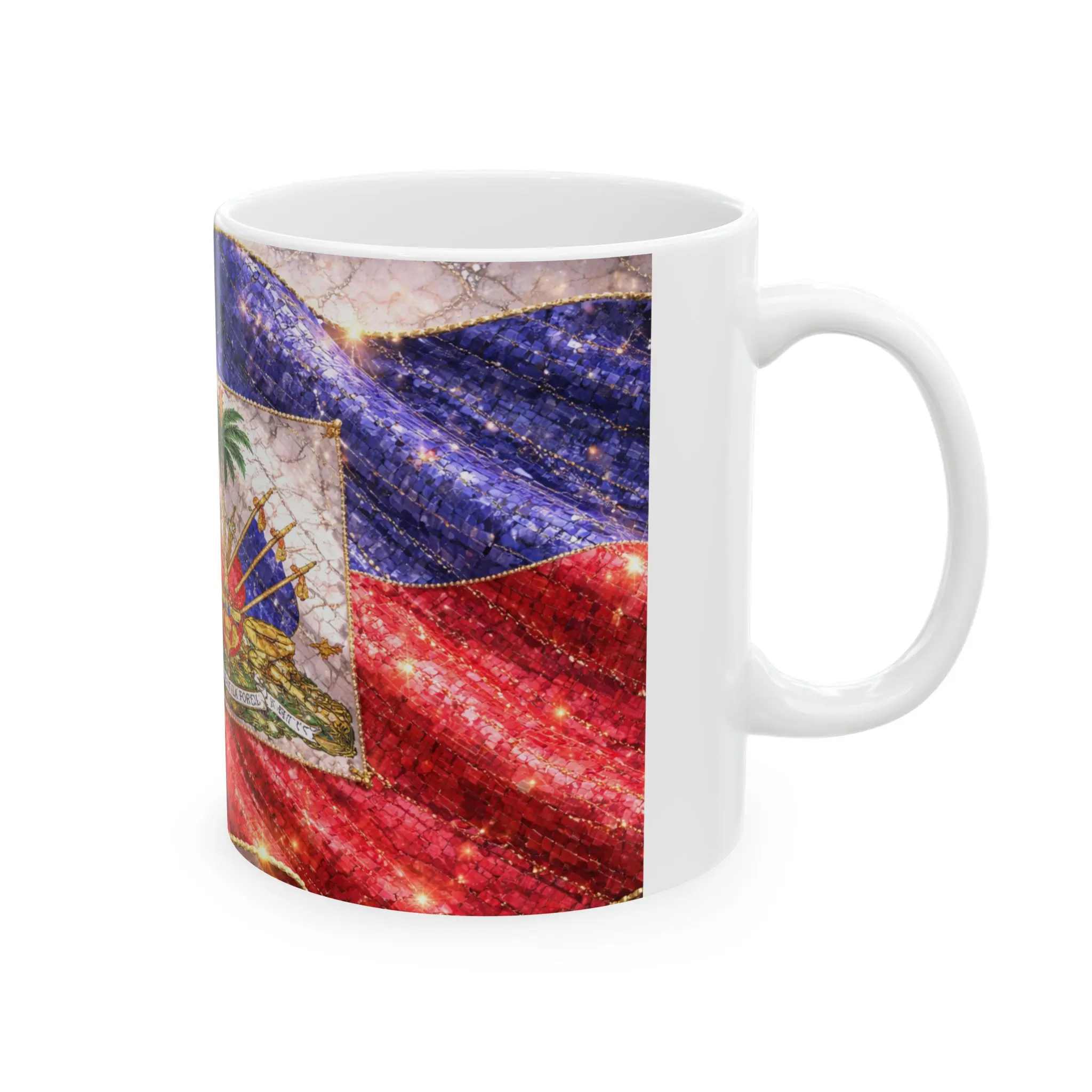 Sip slowly and feel a quiet pride. This glossy ceramic mug features a richly colored, textured wrap of the Haitian flag and coat of arms, printed with vibrant inks that bring every fold and thread to life. It warms hands and morning routines alike—solid, bright, and built to last through daily use. The comfortable C-handle and smooth finish make it easy to reach for during early coffee rituals, study sessions, or windy afternoons when a reminder of home or heritage is welcome. Dishwasher- and microwave-safe, lead- and BPA-free, it’s crafted to showcase bold colors while staying practical for everyday life.
