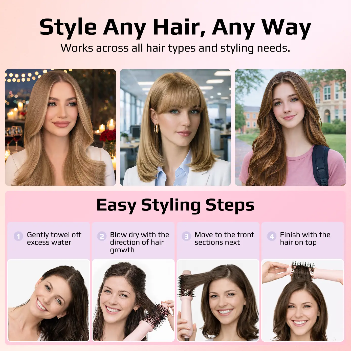 Create sleek blowouts, soft curls, added volume, or smooth straight finishes using one integrated styling tool — no need to switch between multiple devices.