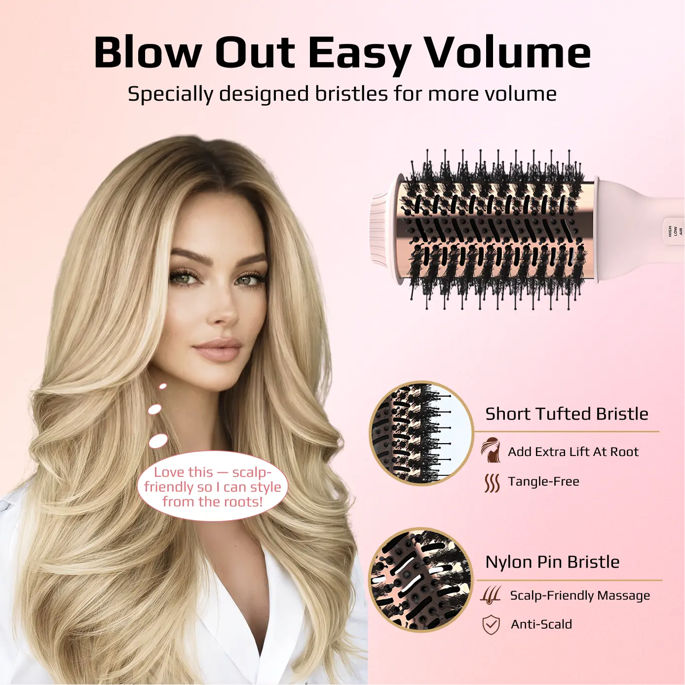 The dual‑bristle design helps detangle gently while lifting at the roots, giving you balanced tension and fuller‑looking blowout results.