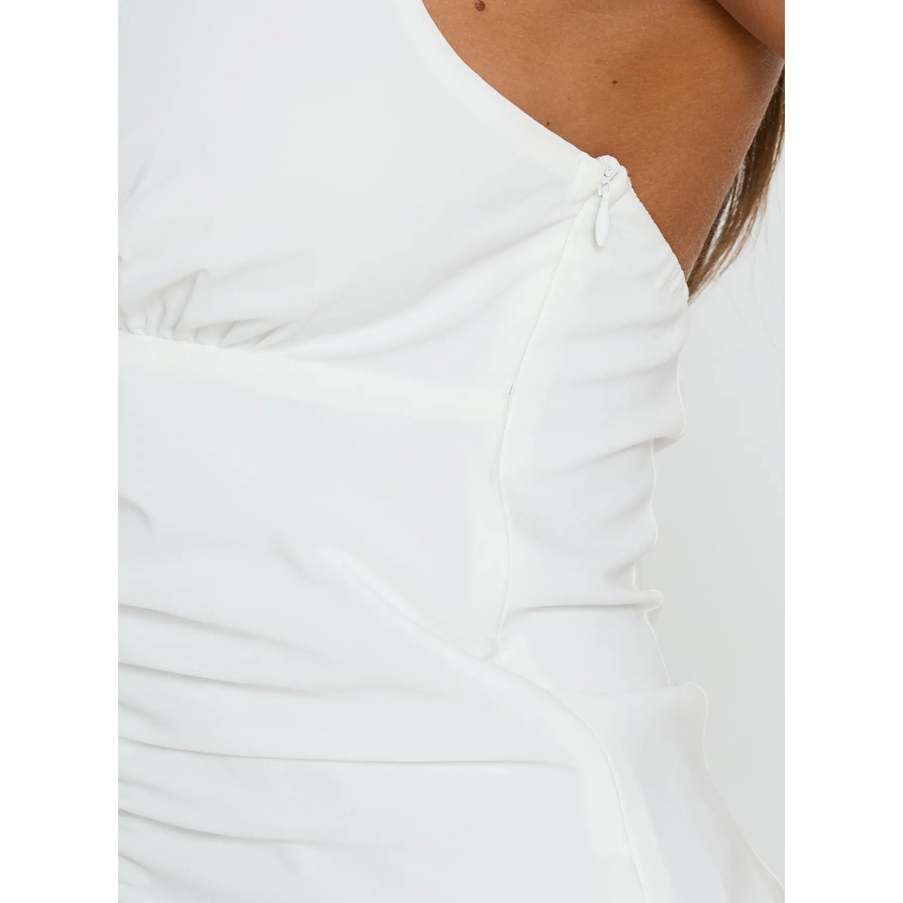 ·Fabric tie neck fastening, ruched torso detailing, tiered skirt, hidden shorts. invisible zip fastening, elasticated back