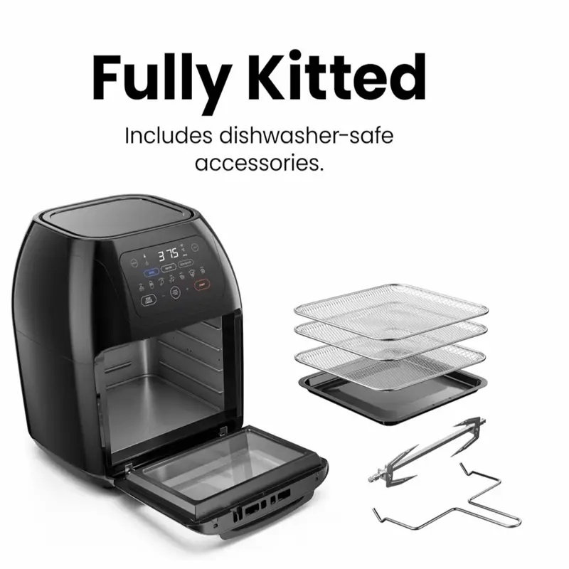 ·All-inclusive: Includes three air flow racks, stainless steel rotisserie oven spit with retrieval tool, and a drip tray