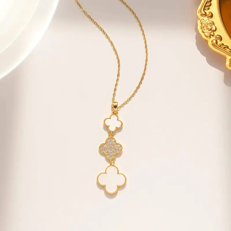 Tassel Black White Clover Necklace in Titanium Steel or Stainless Steel Elegant Jewelry for Women Available in Black or White
