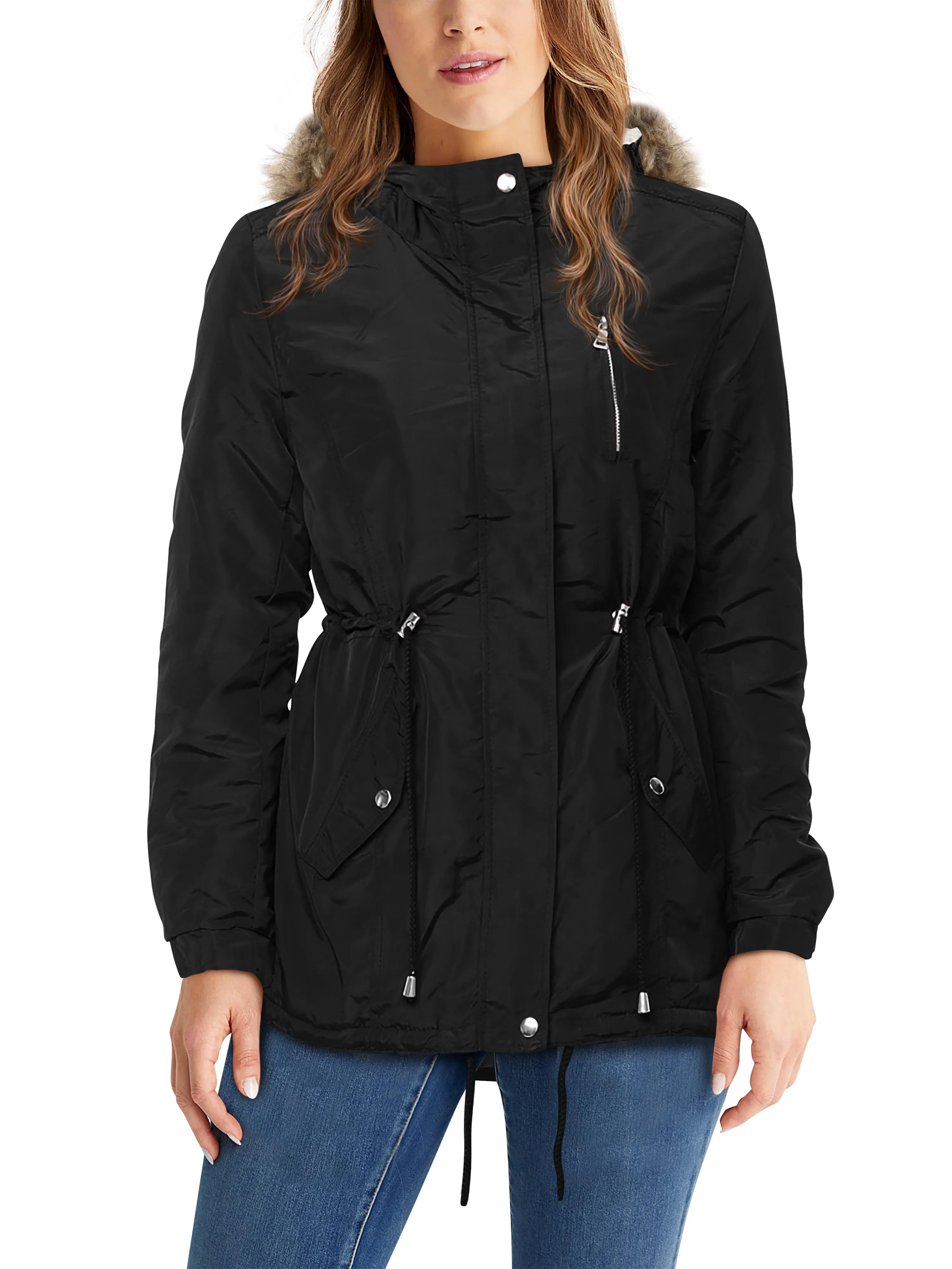 Womens Lightweight / Durable military parka short coat with adjustable waist for women. This jacket was designed basic with two side pockets and one utility pocket for warm storage spaces during fall and winter. The anorak jacket is wind-resistant and designed with warm faux fur hood for premium softness. This Hooded Anorak Jacket was designed as a response to our customers' demand for versatility of outdoor and casual activities.