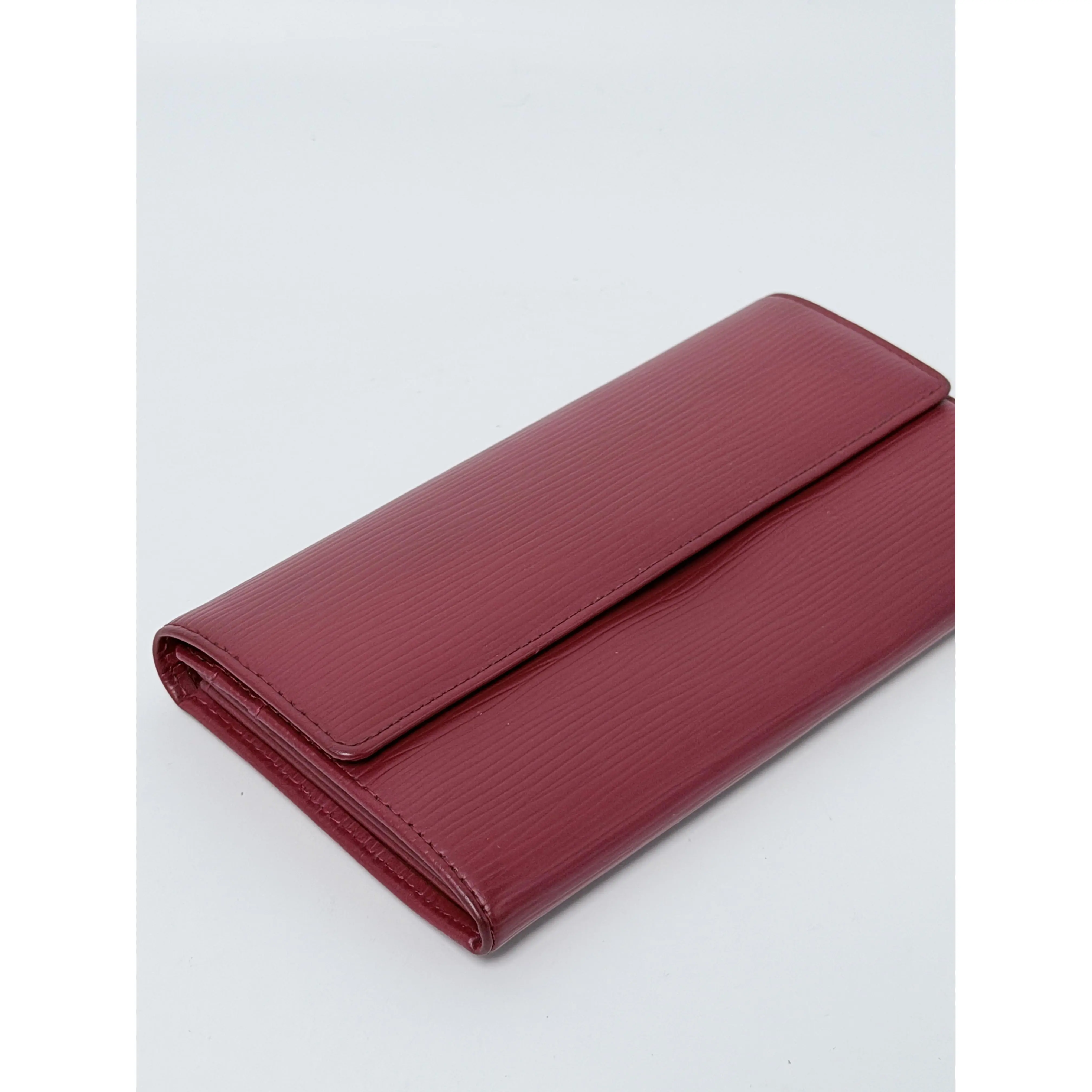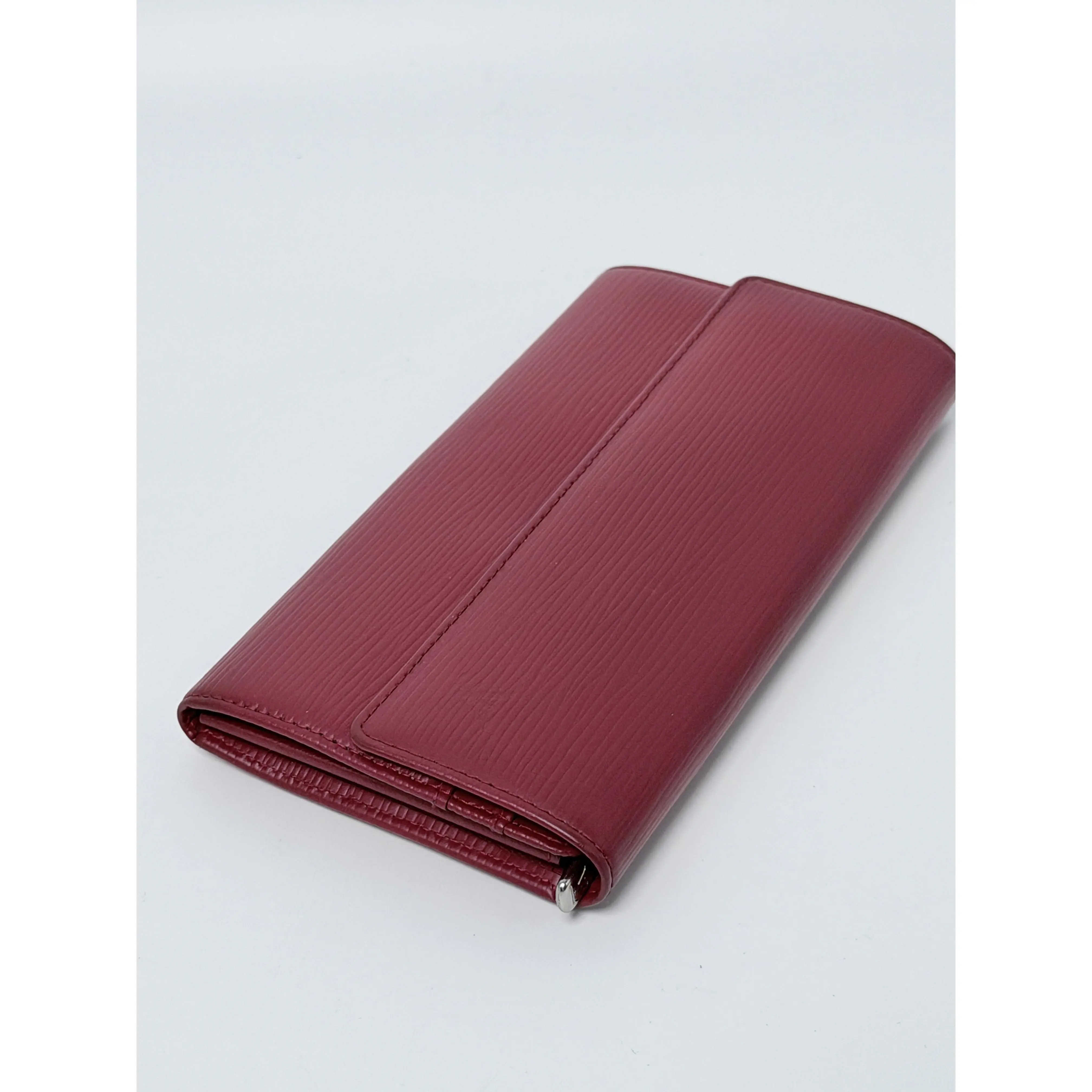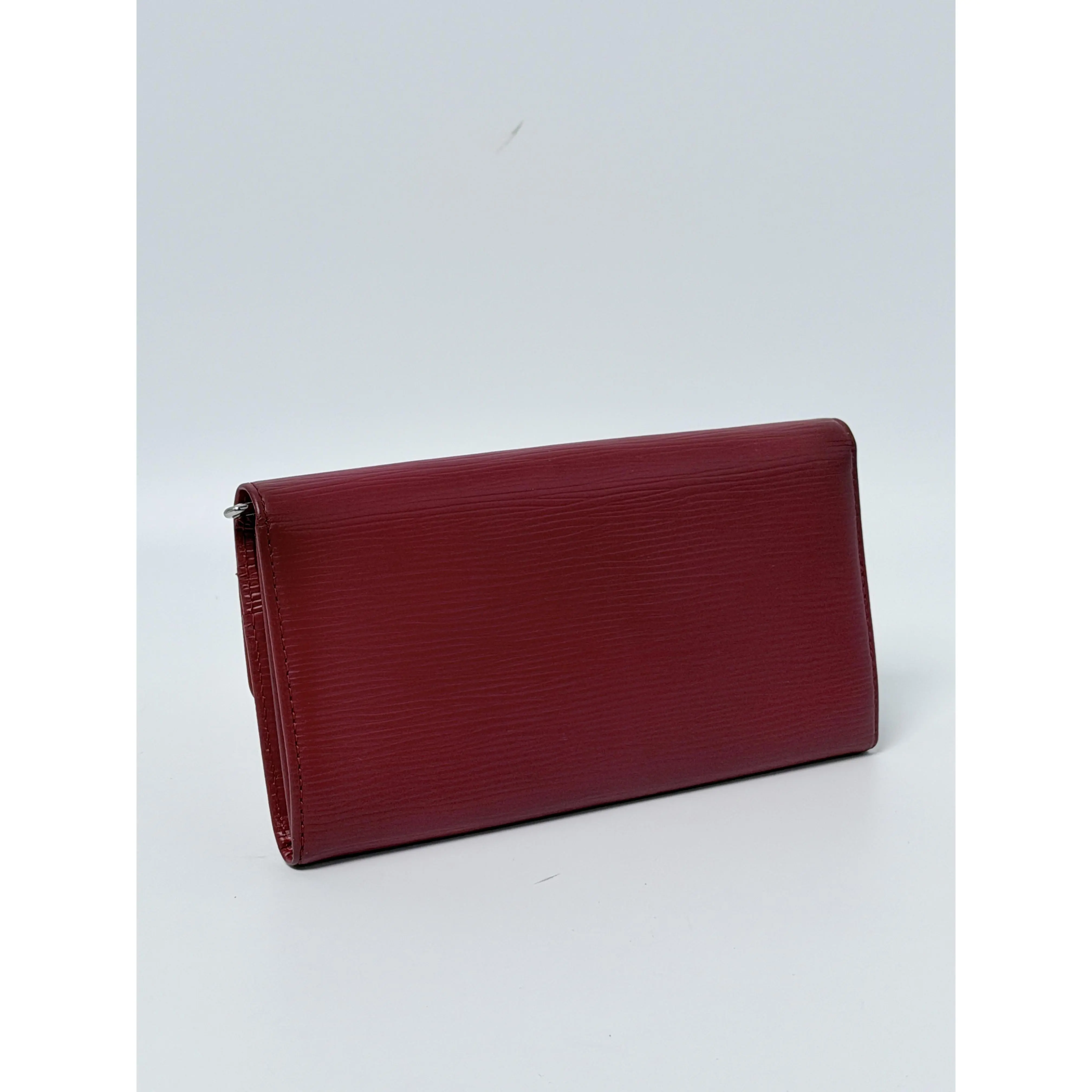 This authentic pre-owned Louis Vuitton Sarah Wallet (also referred to as the Portefeuille Sarah) is a masterclass in elegant organization and exceptional durability. Meticulously handcrafted from the brand's iconic Epi leather—a premium, textured cowhide known for its scratch resistance—this wallet is presented in a sophisticated deep red hue, often referred to as Rubis or Ruby Red. Its structured envelope-style silhouette opens via a secure snap closure to a well-appointed interior, designed to keep your currency, cards, and receipts neatly secured.