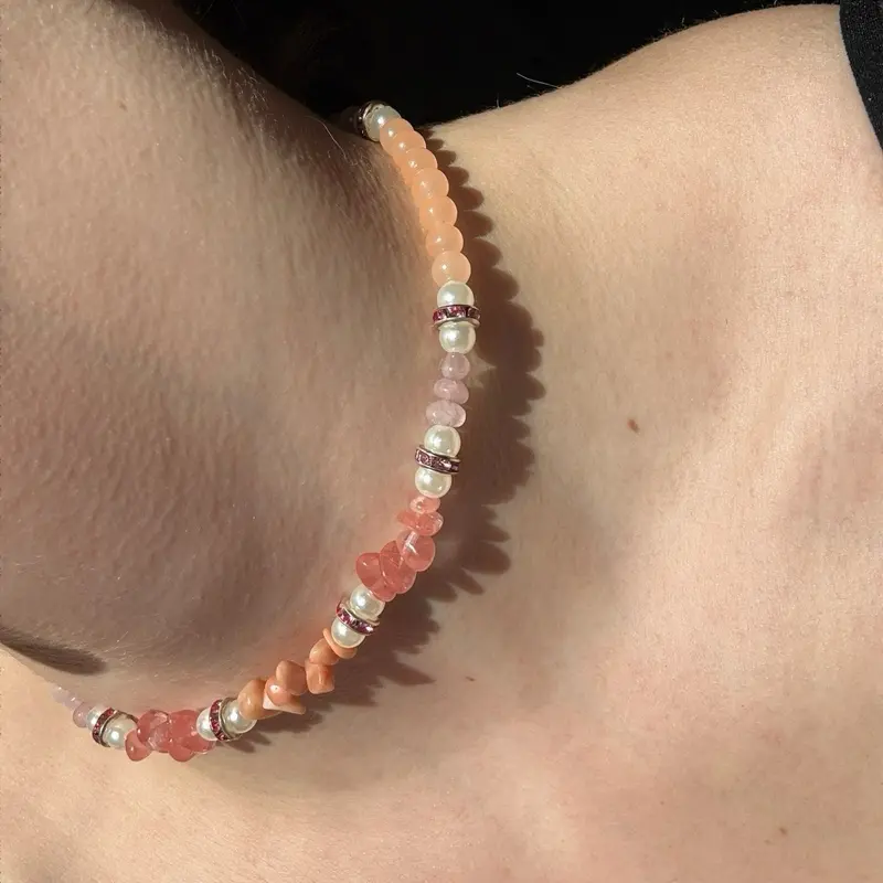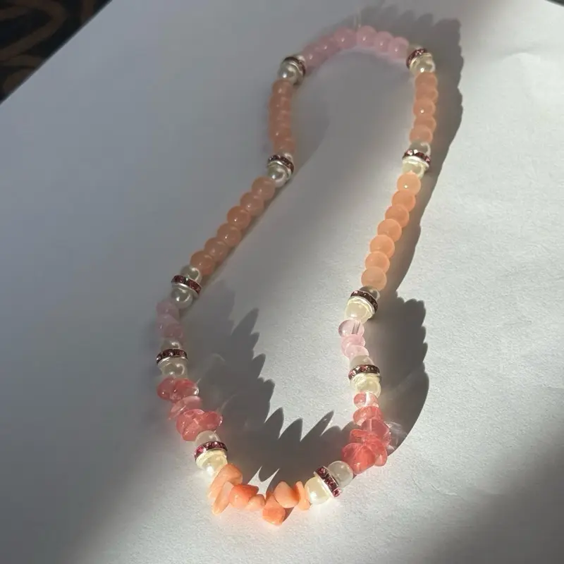 PEACH CALCITE, STRAWBERRY QUARTZ, AND ROSE QUARTZ ELASTIC GEMSTONE NECKLACE❣️