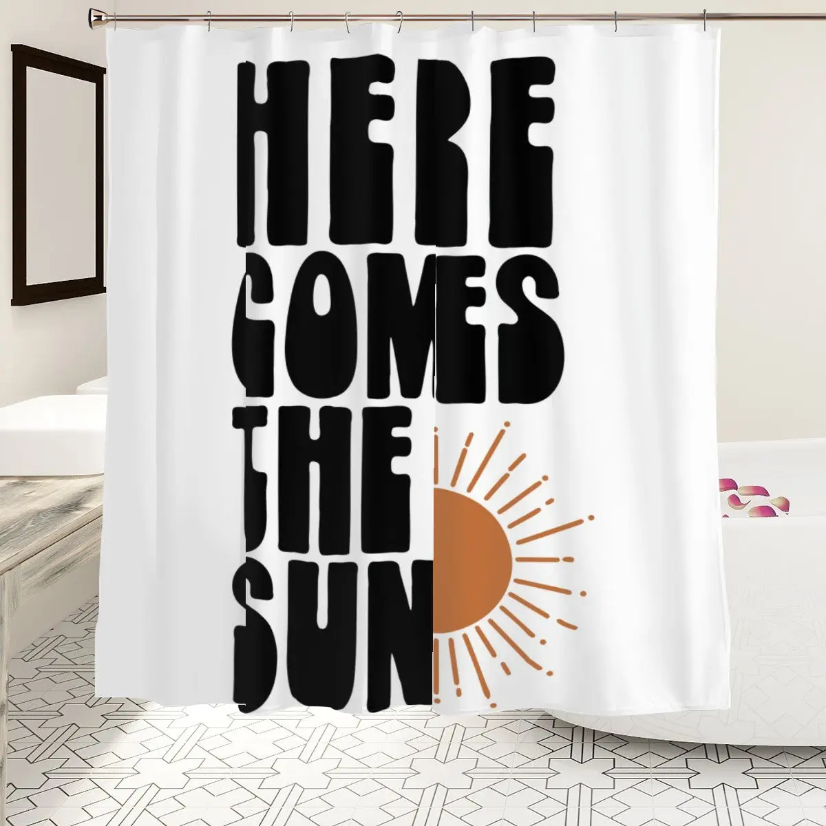 Wake up your bathroom with a sunny, retro vibe. This bold shower curtain features chunky, hand-lettered text stacked vertically and a warm half-sun illustration peeking from the side. The high-contrast black lettering on a clean white field gives a modern graphic punch, while the muted terracotta sun softens the look for a lived-in, vintage feel. It hangs with twelve standard buttonholes and brings a bit of optimism and personality to the daily routine—whether you’re getting ready for work or slowing down with an evening shower.