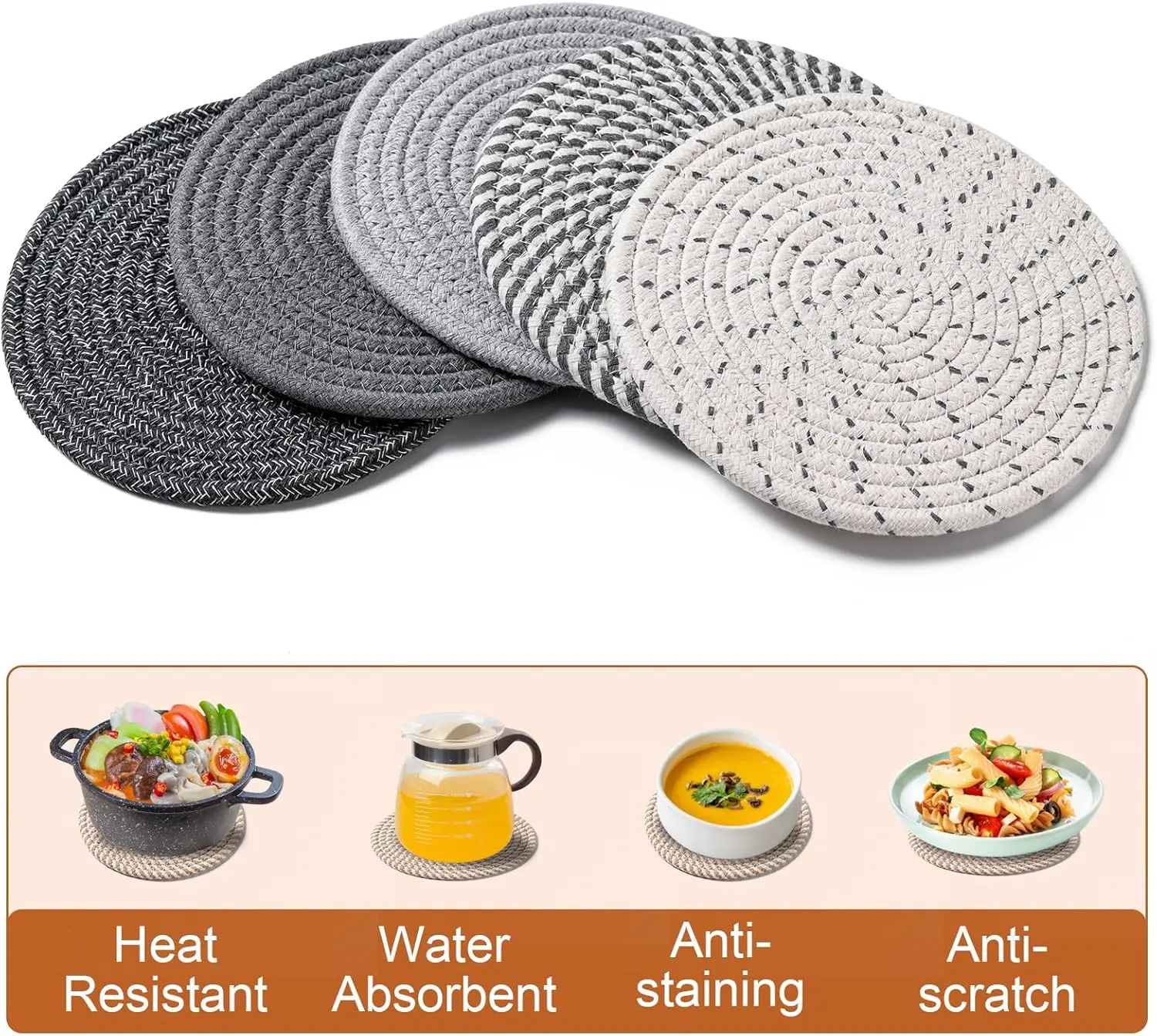 7 Inch Trivets for Hot Dishes, Pots and Pans, 5 Heat Resistant Pot Holders for Kitchen, Home Essentials, Hot Pads for Countertop and Table, Farmhouse Decor Vase Mats, Gray