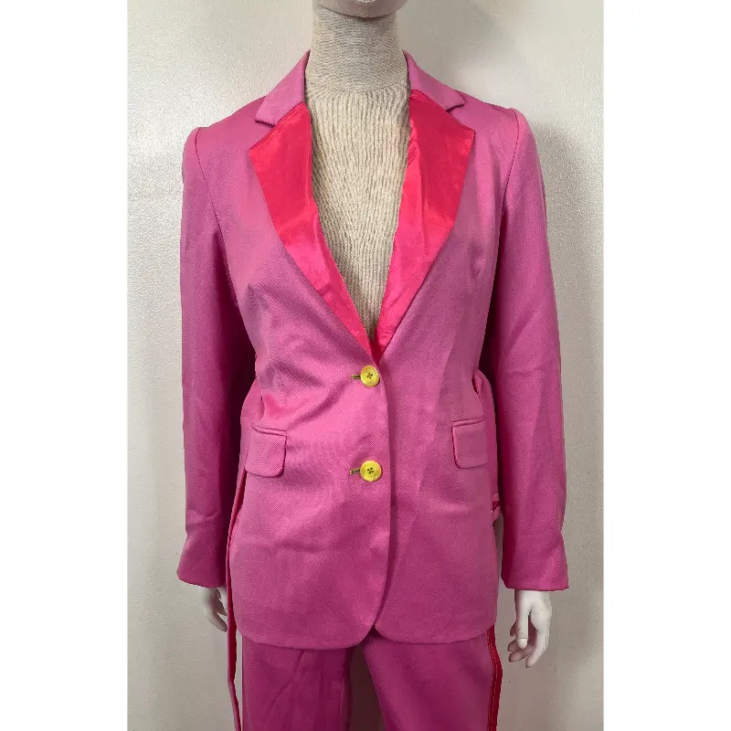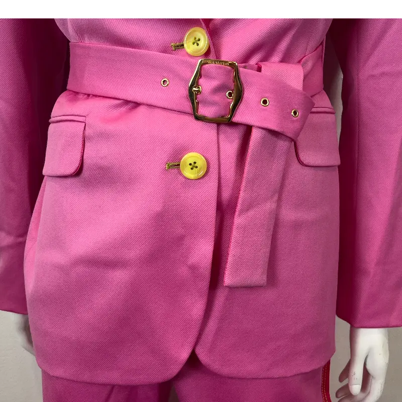 SIES MARJAN TERRY BELTED SATIN-TRIMMED WOOL-TWILL FULL TUXEDO SUIT IN PINK AND YELLOW BUTTONS IN A MARKED SIZE 0. WORN ONCE TO AN EVENT AND STORED AWAY, PRISTINE CONDITION. POCKETS ARE STILL SEALED.