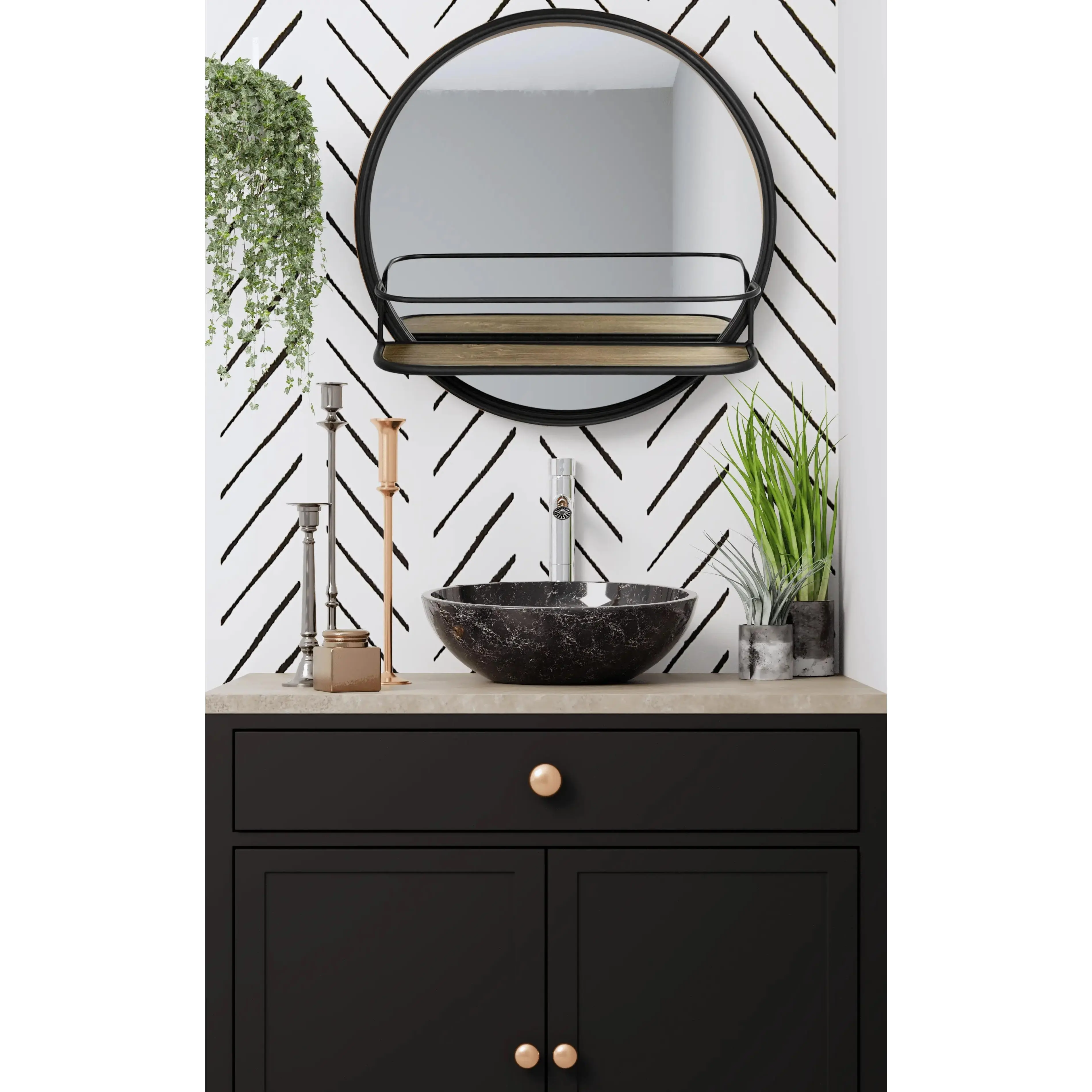 The Pharmacy Mirror is a stylish and functional addition to any room in your home. The metal frame and round mirror adds a modern touch, while the built-in storage shelf is perfect for displaying plants, decor, or other accessories. Sleek and versatile, this mirror can be used in the bathroom, hallway, or entryway for a touch of bright style.