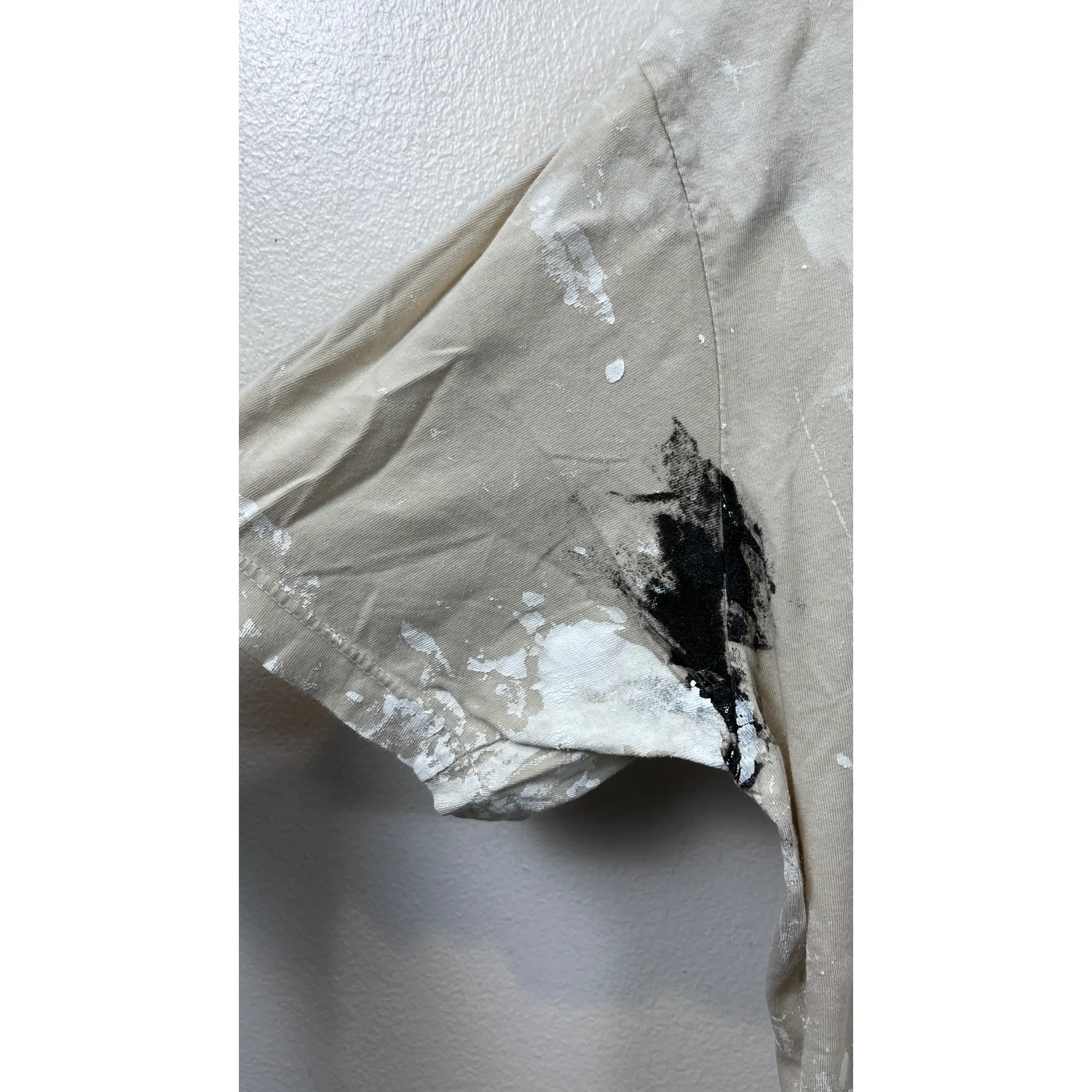 HAND DESTROYED VINTAGE FABRIC CREWNECK. HAND SILK SCREENED, PAINTED, DYED, HAND FRAYED, HAND SEWN LABELS AND DETAILS AT NECK IF PRESENT. PRINT ON PRINTS. STITCHING IS MEANT TO FRAY AND FALL APART