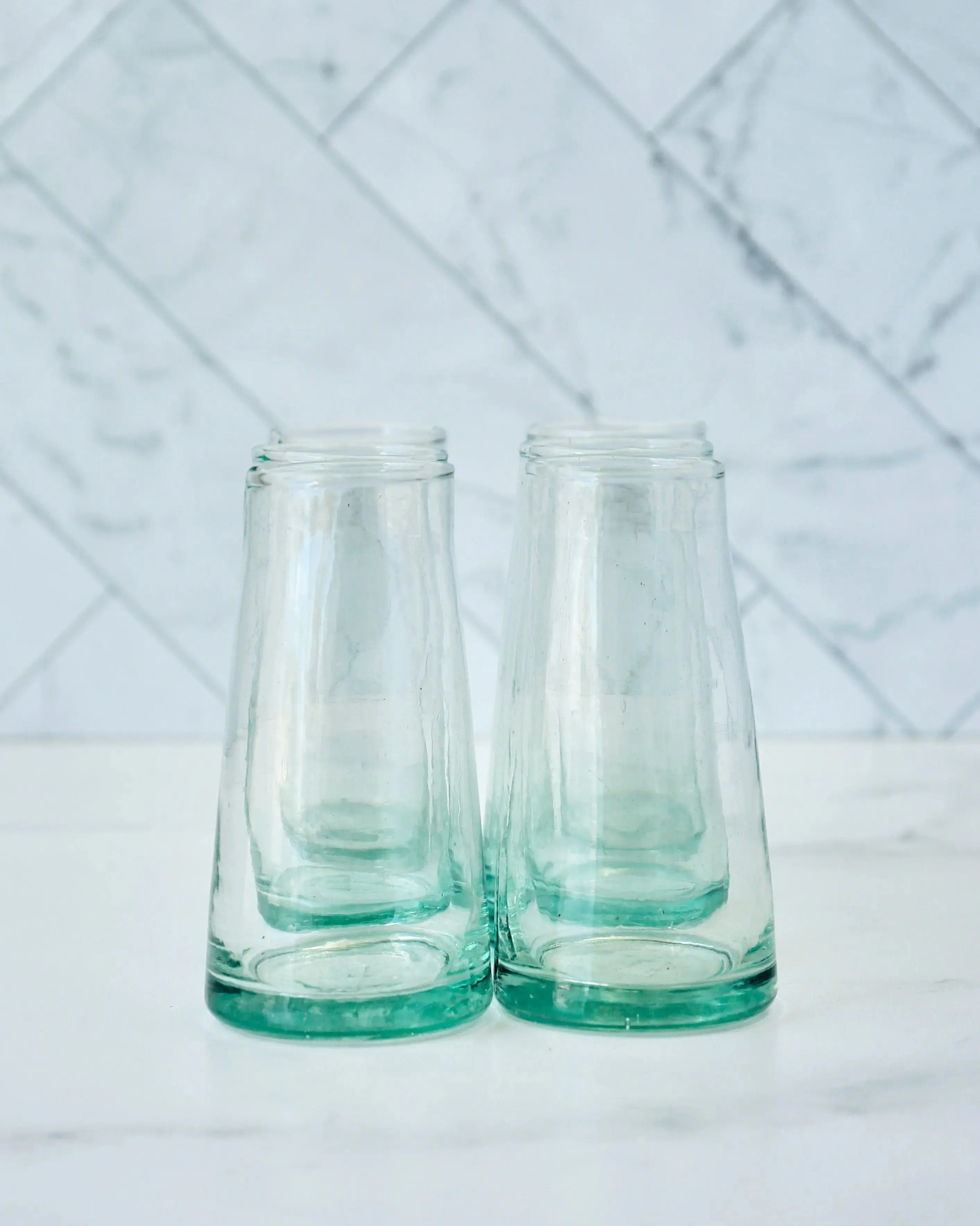 Looking for a unique and stylish way to enjoy your next glass of bubbly? Look no further than these gorgeous hand blown Moroccan champagne glasses. Each one is entirely unique, blown from recycled wine bottles into beautiful and sustainable vessels. This also gives each glass an organic, free-flowing shape that is truly eye-catching. Whether you're toasting a special occasion or simply enjoying a glass of champagne on a night in, these glasses are sure to add a touch of class. Bubbles rule!