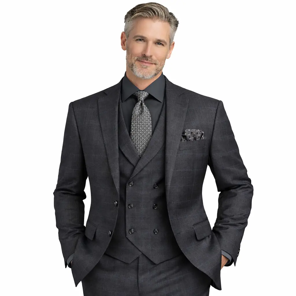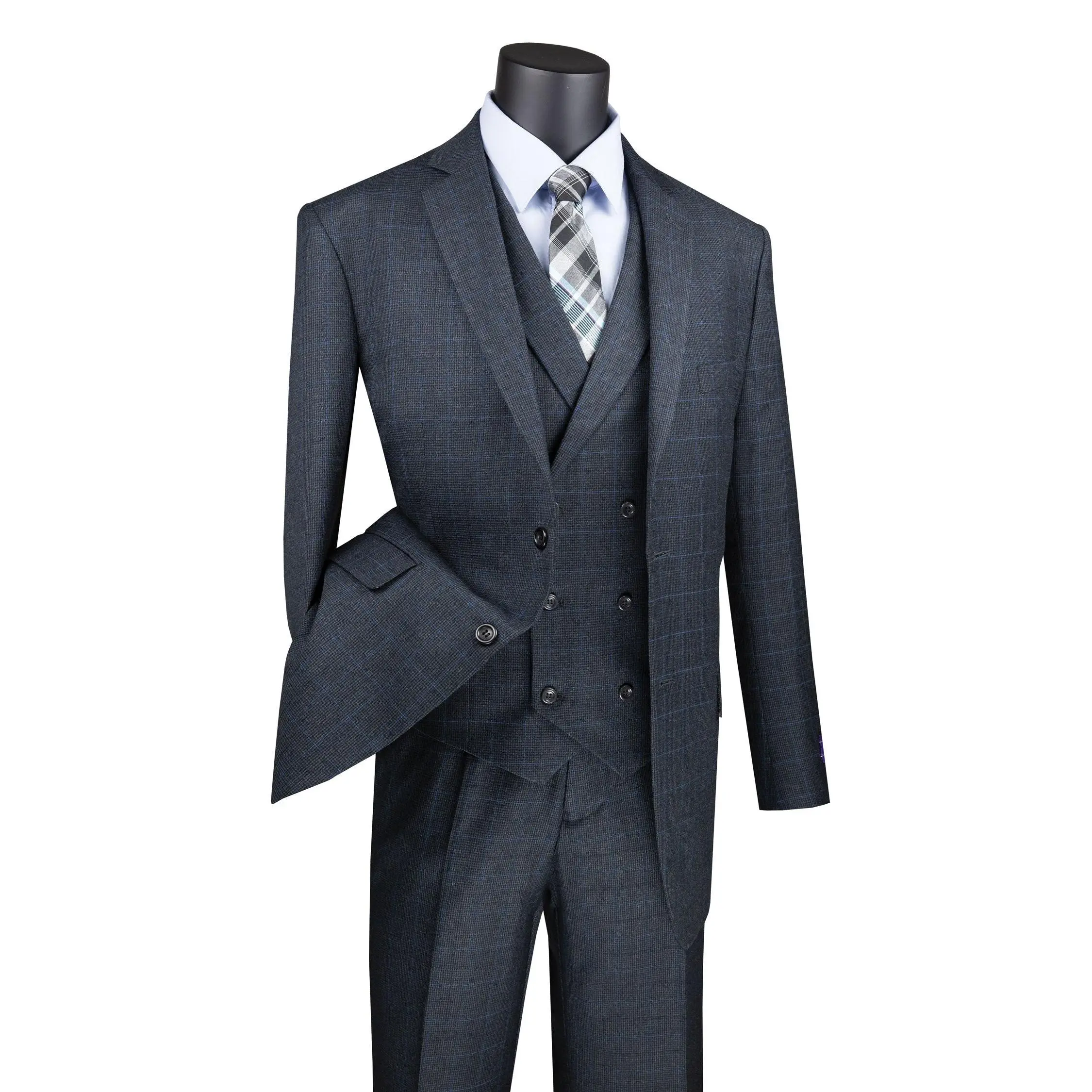 Classic 3-piece suit featuring a 2-button jacket, flat front pants, and a sharp double-breasted vest. Finished in a clean windowpane plaid, it delivers a polished, tailored look that works for any occasion.