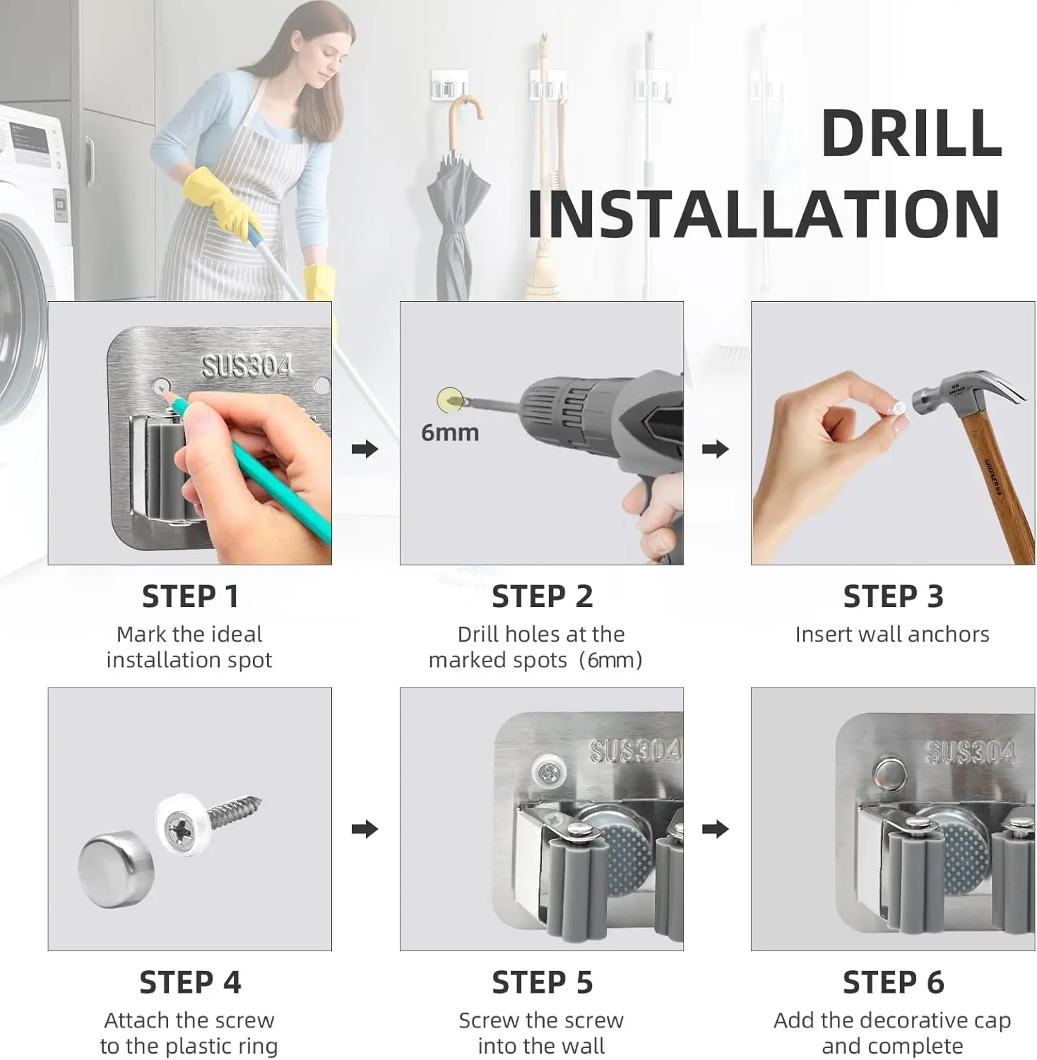 ·🧹【Size & Accessories】Please note that this mop hanger is suitable for tools with a handle diameter between 0.8-1.3 inch. With the enlarged base (3.35*2.5 in) and back reinforced screws provide extra support. Each bracket paired with 2 screws, 2 anchors, 2 plastic rings & 2 decor caps. Drill Installation with screws ensures a safer fixation compared with adhesive.