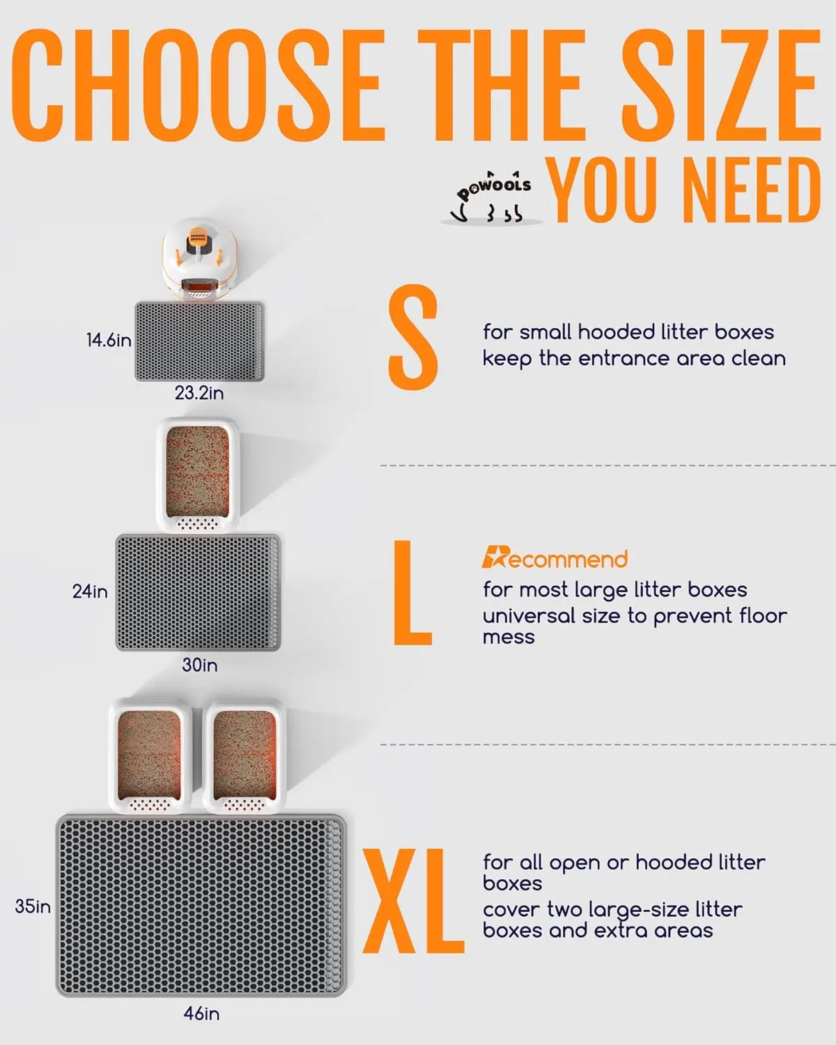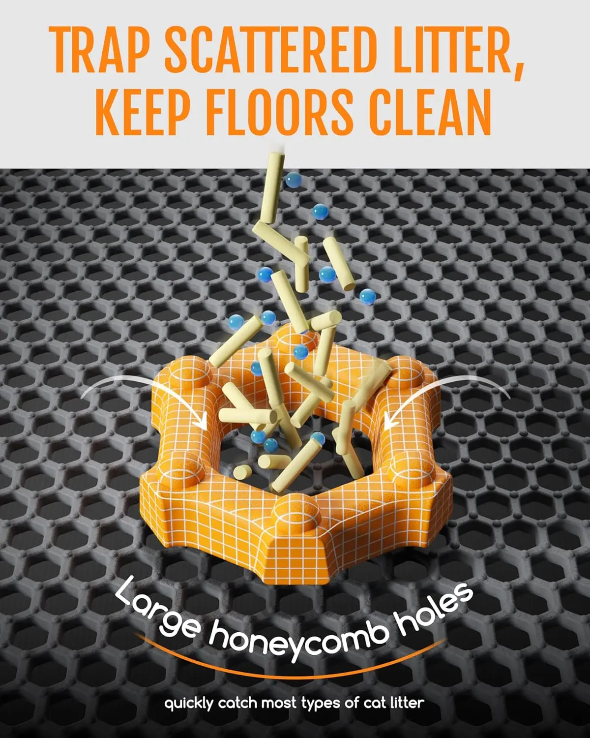 ·EFFECTIVE LITTER CATCHER: The Powools double-layer kitty litter mat minimizes litter tracking and keeps floors tidy. The upgraded honeycomb holes on the top layer trap loose litter from the box and cat's paws, allowing it to fall through and collect securely in the bottom layer. Besides, this mat is suitable for all types of cat litter, including clumping, crystal, and pellet.