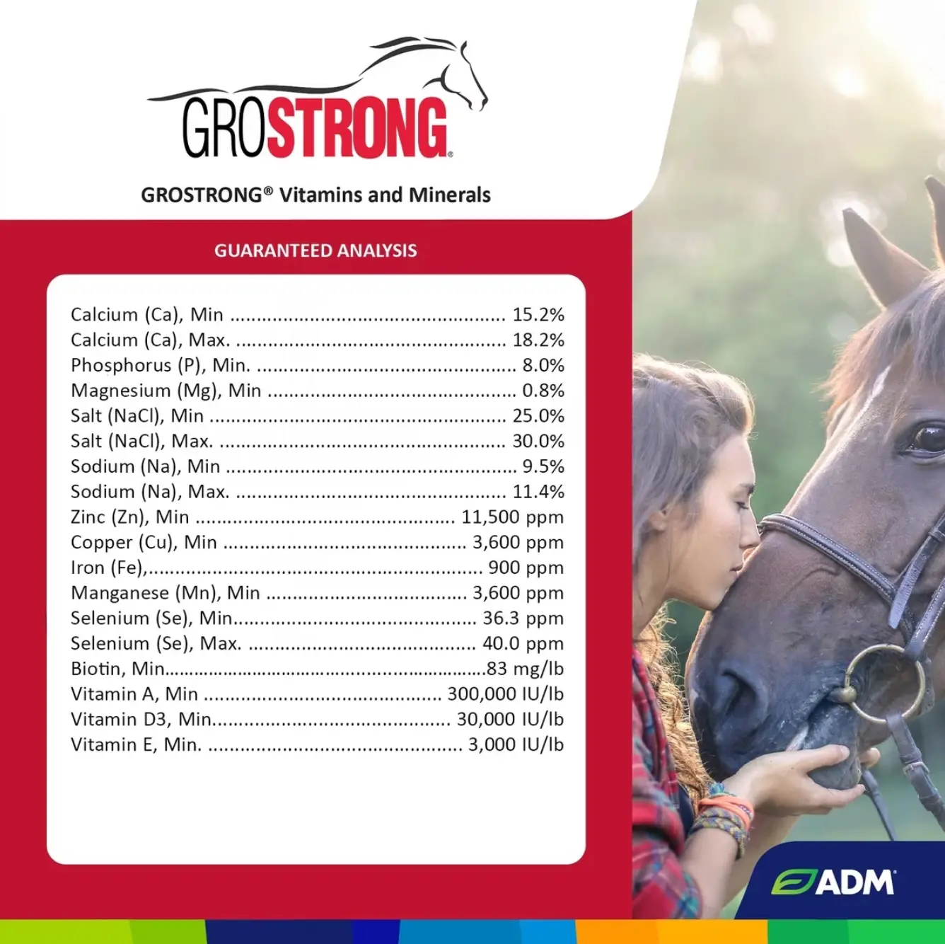 Mixed with Feed: For horses expected to consume 5 lbs of concentrate mix per horse daily, add 50 lbs of granular GROSTRONG vitamins and minerals for horses per ton of mix. For horses expected to consume 10 lbs of concentrate mix per horse daily, add 25 Ibs of granular GROSTRONG vitamins and minerals for horses per ton of mix, etc.