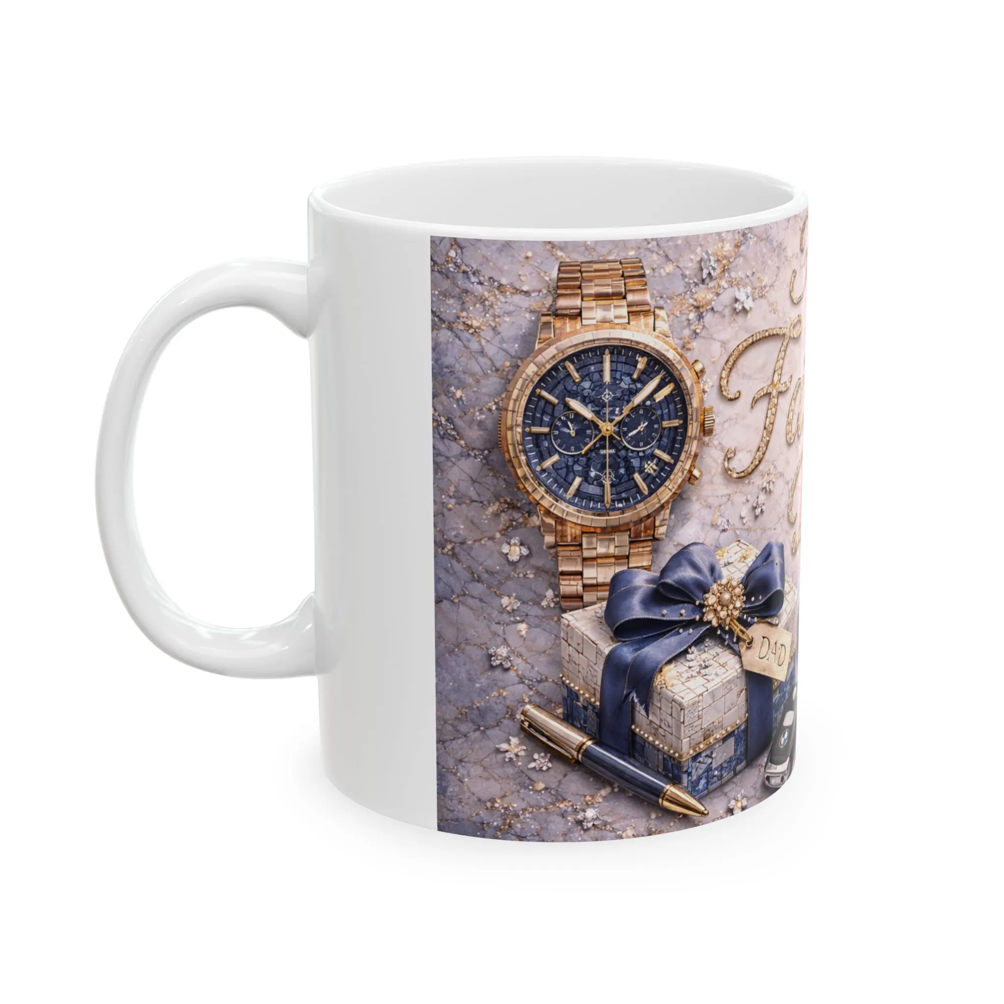 Warm, nostalgic, and quietly celebratory—this glossy ceramic mug brings a gentle, handcrafted vibe to Father’s Day moments. The vintage-inspired design layers soft florals, a striped tie, car keys, and a bow-tied gift tag around the script “Happy Father’s Day,” creating a scene that feels like a memory in a photograph. It’s the kind of mug that sits on the kitchen counter during slow morning conversations or accompanies an afternoon of puttering in the garage. Durable, bright-print finishes keep the artwork vivid through everyday use, so each sip becomes a small, thoughtful reminder of family and gratitude.