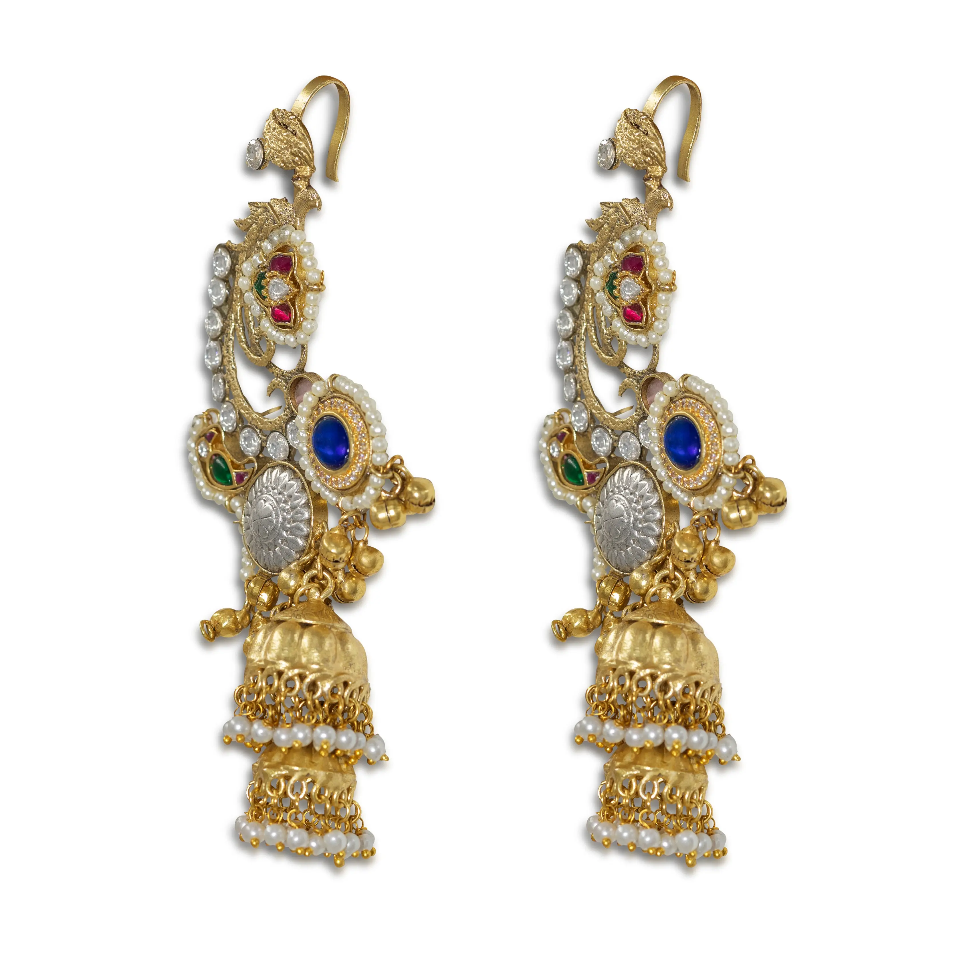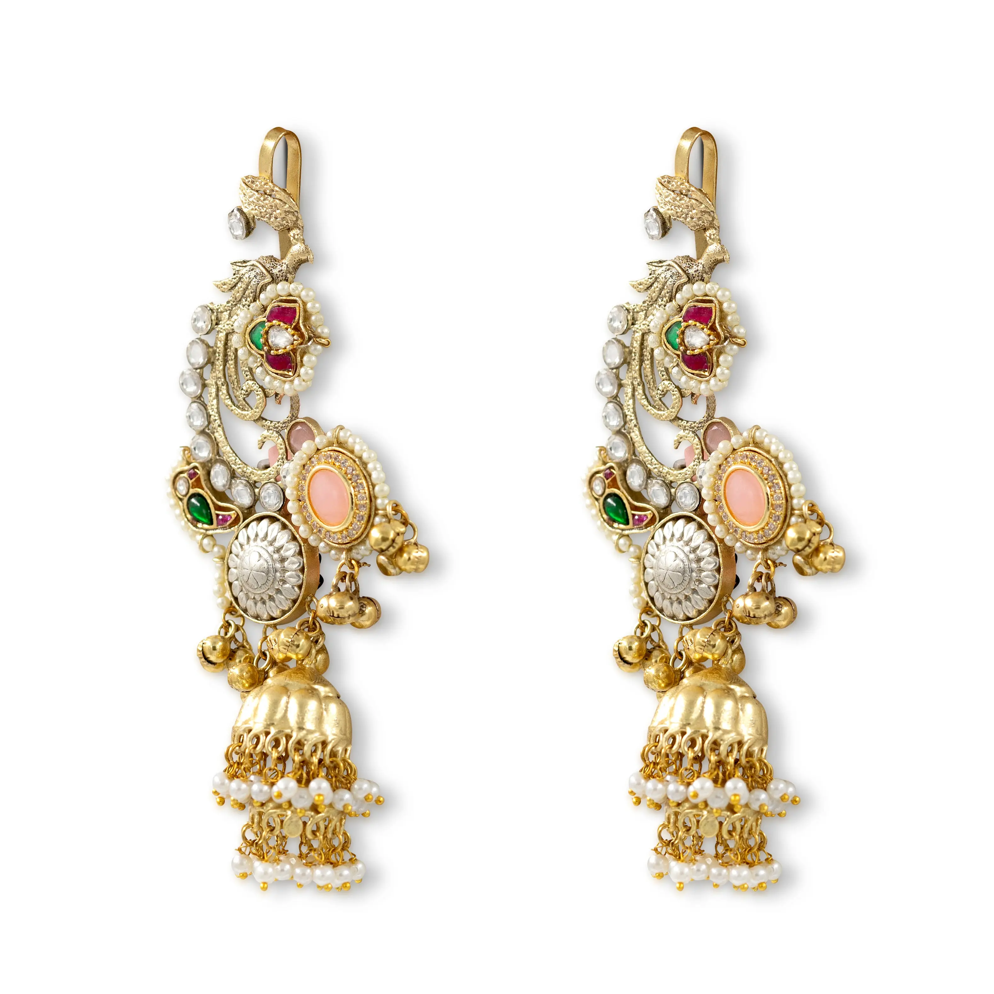 Kashmir has its own jewelry language — it speaks in antique gold, layered craftsmanship, and stones that seem to hold the warmth of the valley within them. These Kashmiri Heritage Jhumka earrings are handcrafted in that tradition, featuring intricate antique gold detailing as the backdrop for multicolor stone accents and kundan work. Layered jhumka drops finished with pearl hangings move gently with every step.
