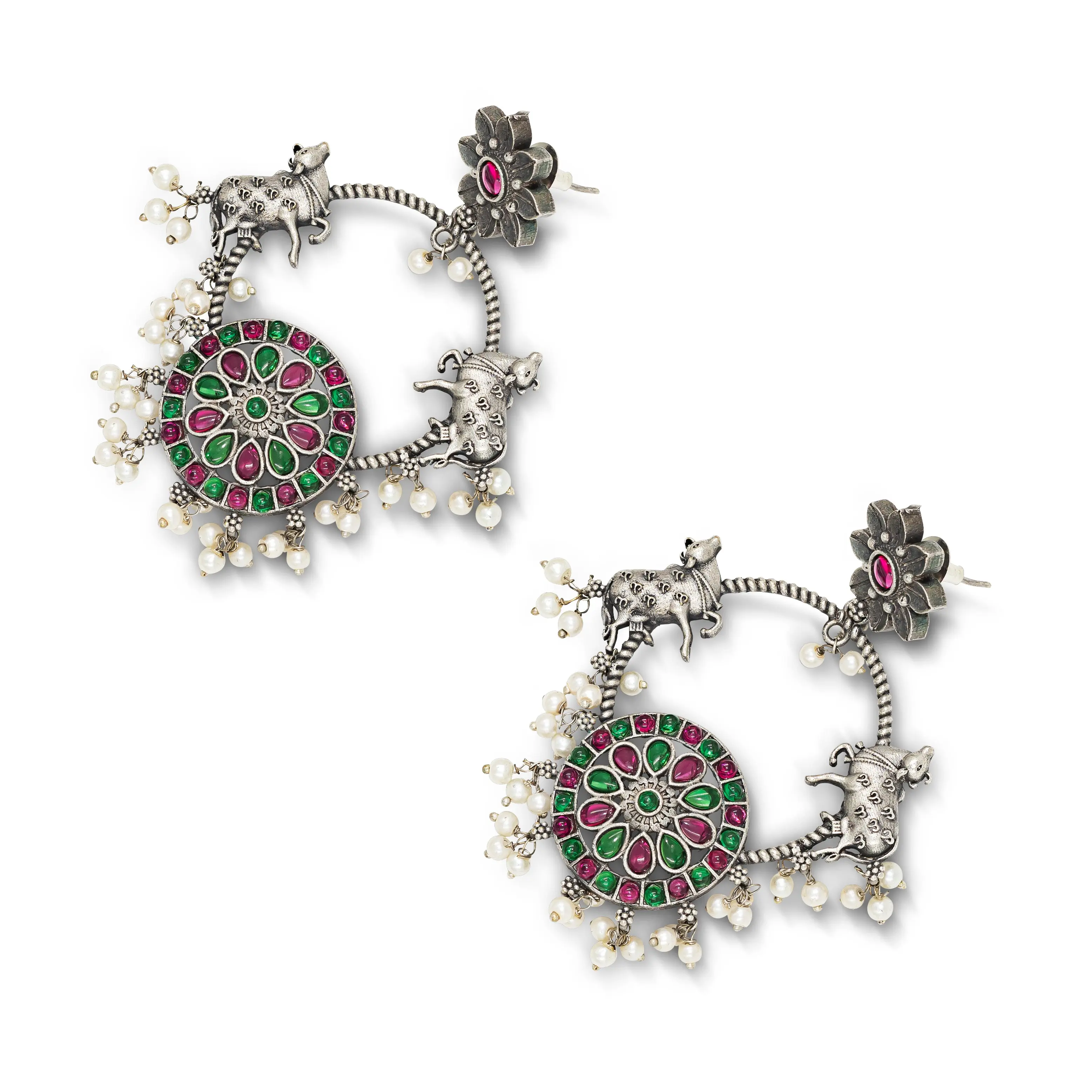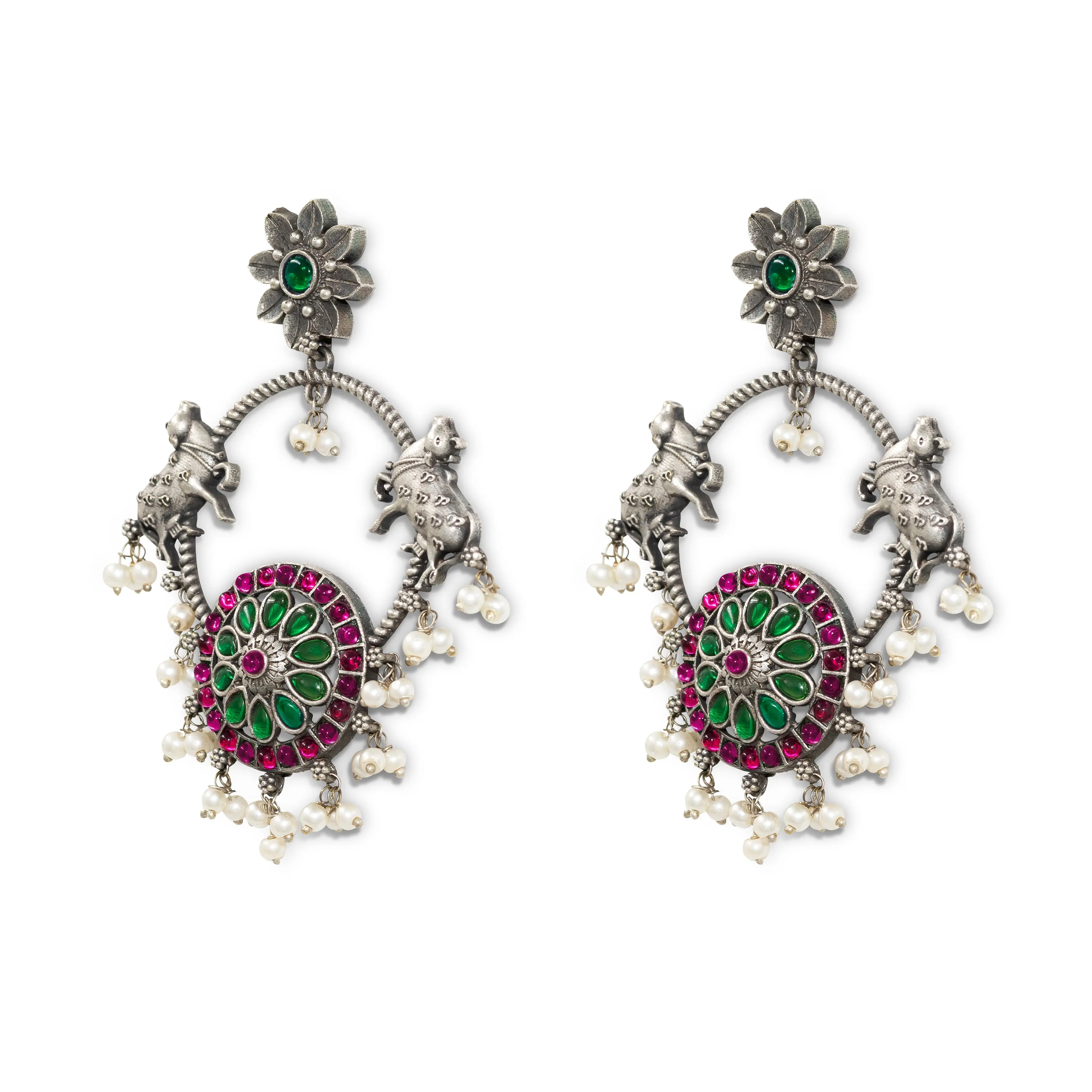 Straight from the jewelry traditions of Rajasthan — these Oxidized Chand earrings are a masterclass in traditional silver craft. The chand (moon) form is rendered in rich oxidized silver with intricate surface detailing, adorned with green and pink stones that bring vibrant Rajasthani color energy to the design. Pearl drops hang from the chand form with gentle elegance, and the oxidized finish develops a beautiful patina with wear.