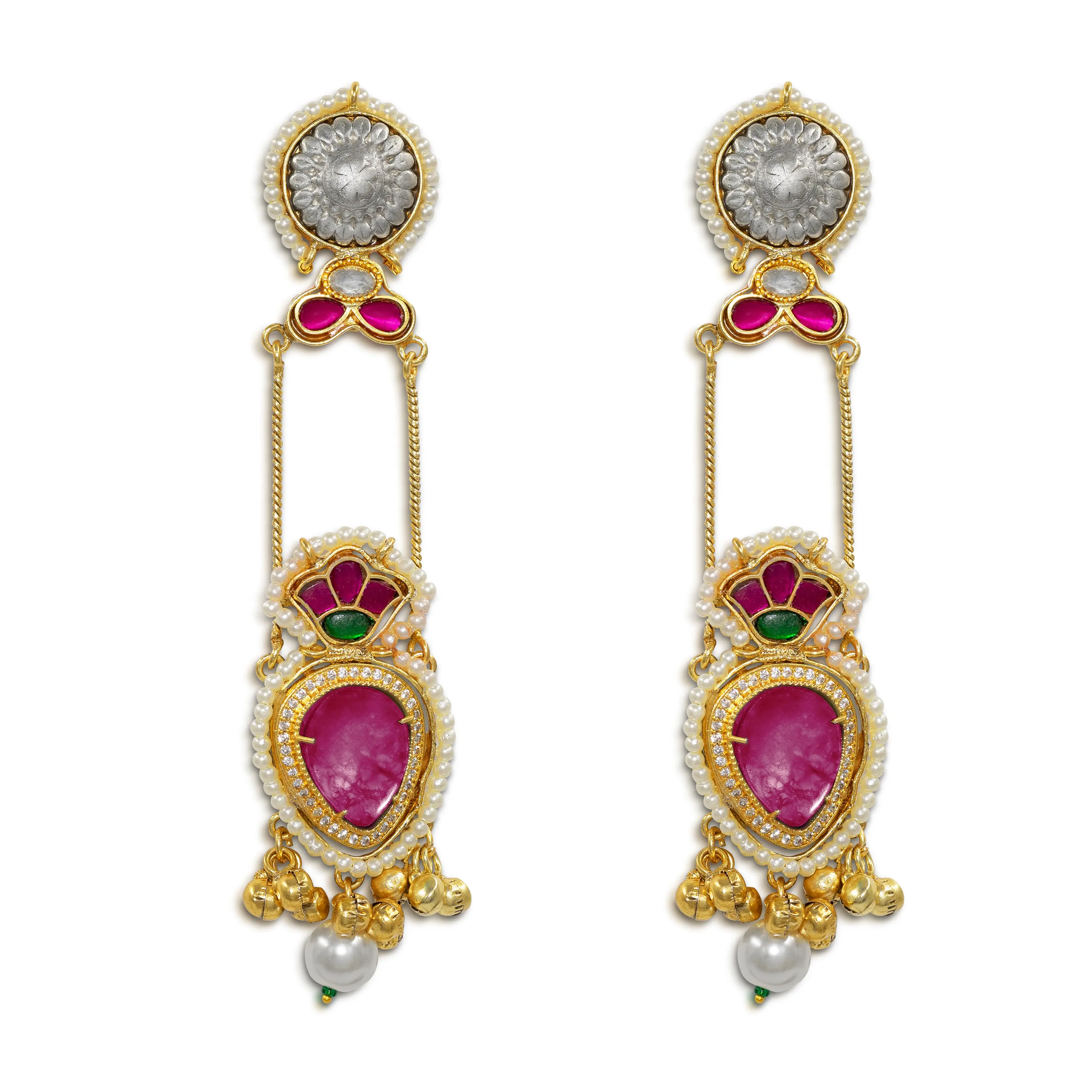These Kashmiri Heritage Drop earrings are a study in elegant restraint. A carved top stud connects via dual chain links to a bold ruby pink teardrop stone centerpiece framed in intricate pearl edging and ghungroo accents. The layered structure — stud, chain, pendant — creates a visual journey from ear to drop that is uniquely captivating. More architectural and refined than a simple dangle.