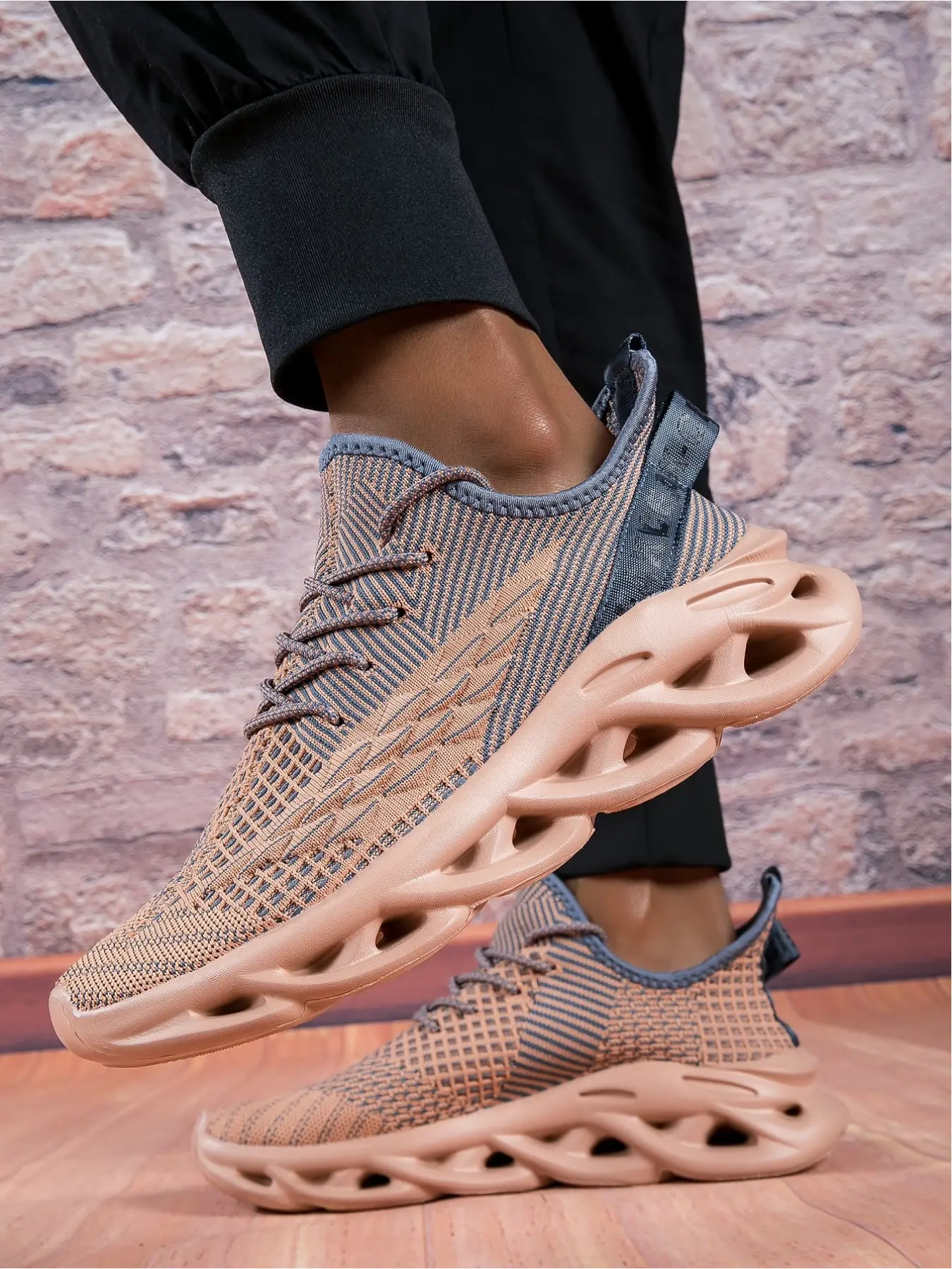 Men's Khaki-Blue Blade Dad Shoes: Full Palm Shock-Absorbing + Breathable Flyknit, Daily Outfit Trendy Sneakers
