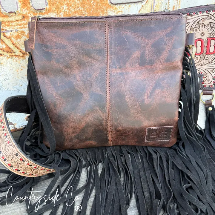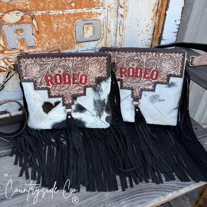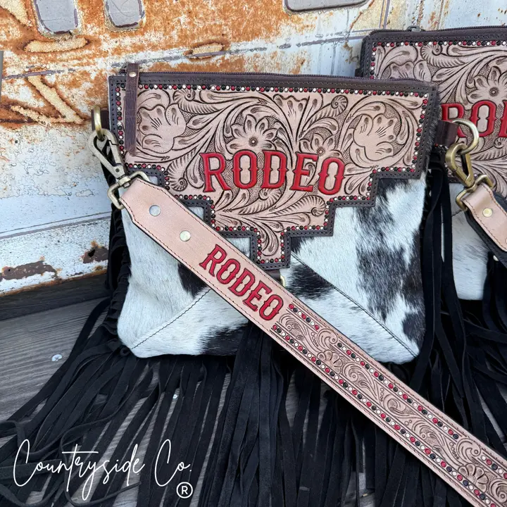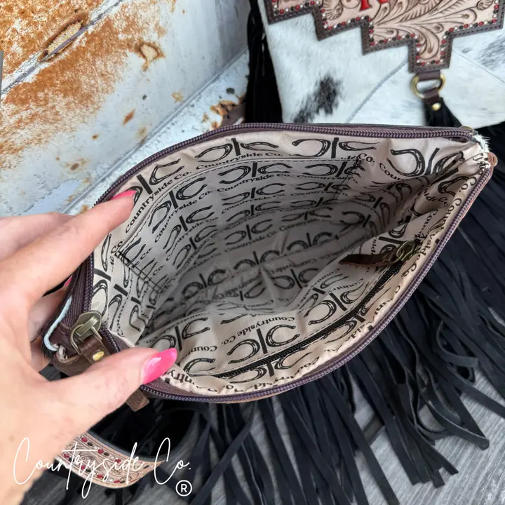 The Rodeo Darling Cowhide Fringe Purse is designed with a punchy style that is perfect for day or night! This is a limited edition! It has a cowhide and tooled leather front with a leather back, finished off with fringes. It has one inside zipper pocket and one side pocket. Shoulder strap is detachable and measures 49 inches. No two bags are alike because they are made with unique cowhides.