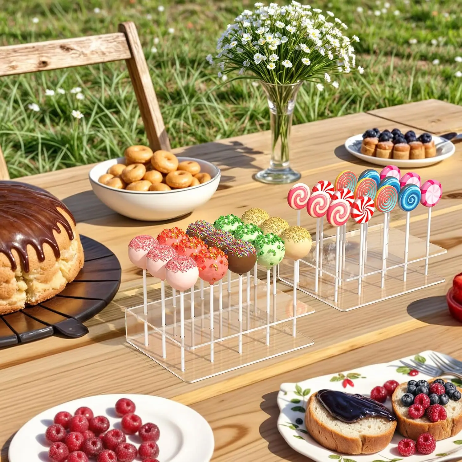 ·SAFE AND ELEGANT CAKE POP STAND---Our cake pop holder are made of food grade premium acrylic. The smooth edges and rounded corners cutting design make you safer when using it. The transparent material makes it fit well into your party display.