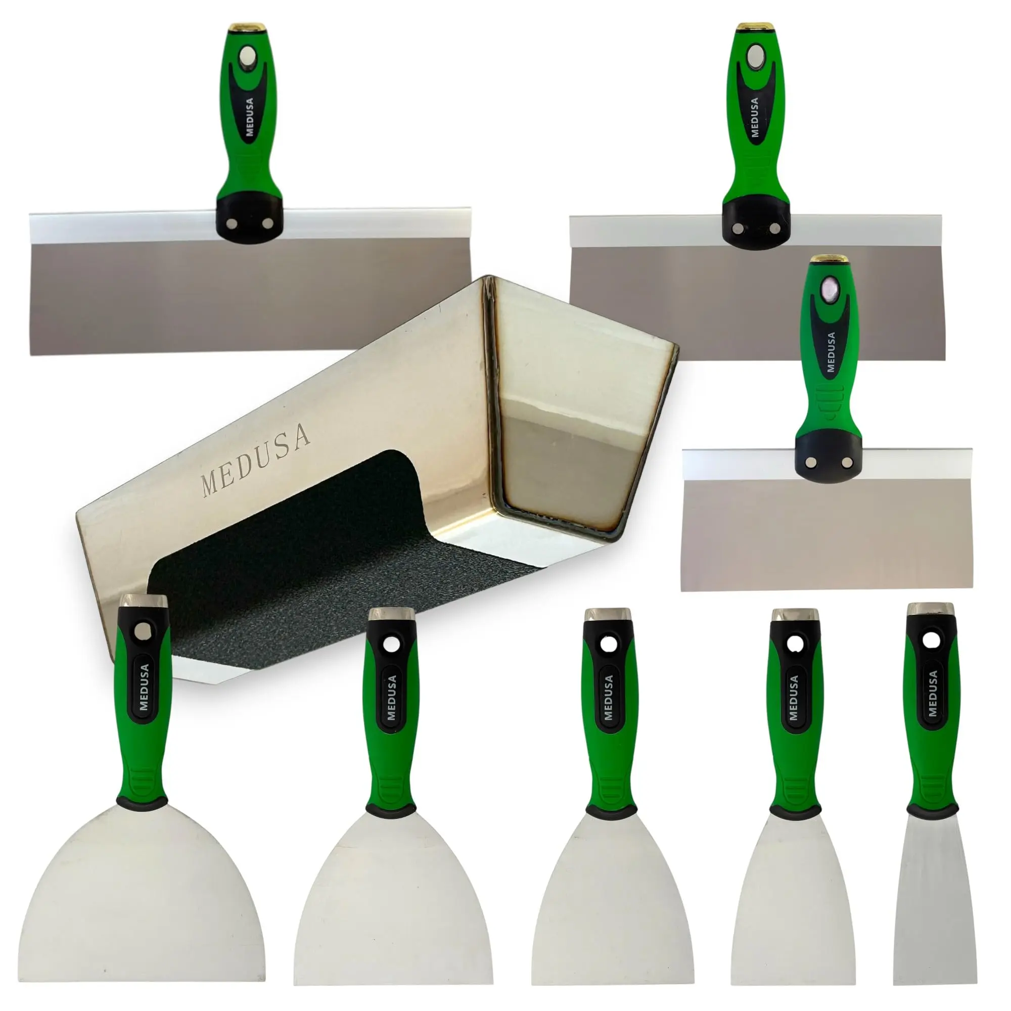 Medusa Drywall Hand Taping Tool Set, a complete corrosion and rust resistant stainless steel kit for professionals and DIYers alike. The putty knives in this set have slightly more flexibility than most professional grade blades, giving you more control of your application and finishing techniques. This set includes all the right size knives you will need from start to finish. Medusa products are designed and put together by finishers for finishers. The Medusa Drywall Hand Taping Tool Set has everything you need to tackle whatever drywall taping project you have. This kit is made of high quality professional grade materials so its designed to last. Also includes an easy clean professional grade 0.7mm stainless steel mud pan with a comfortable non slip-grip which is a must for most, especially with wet, sweaty, dirty or cold hands