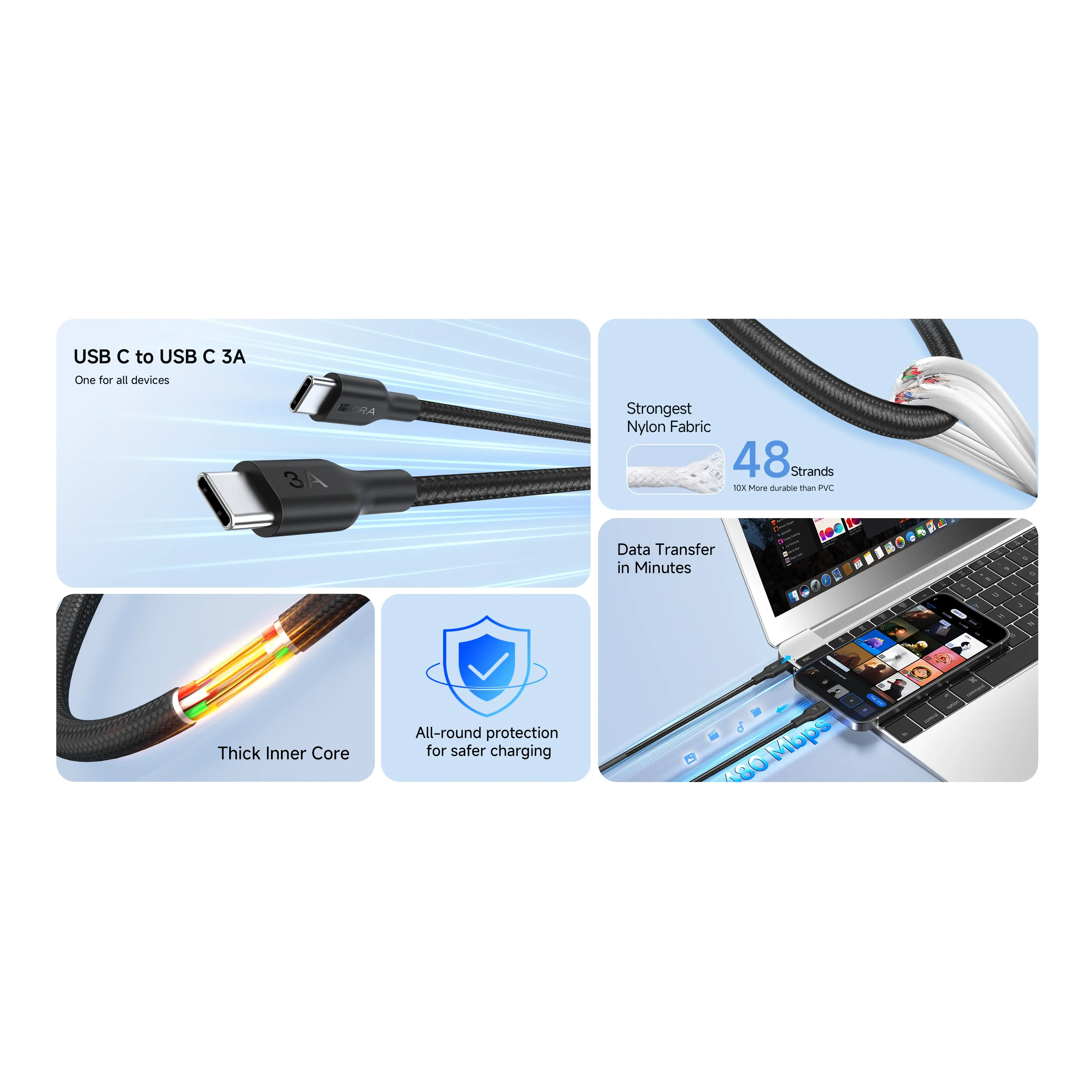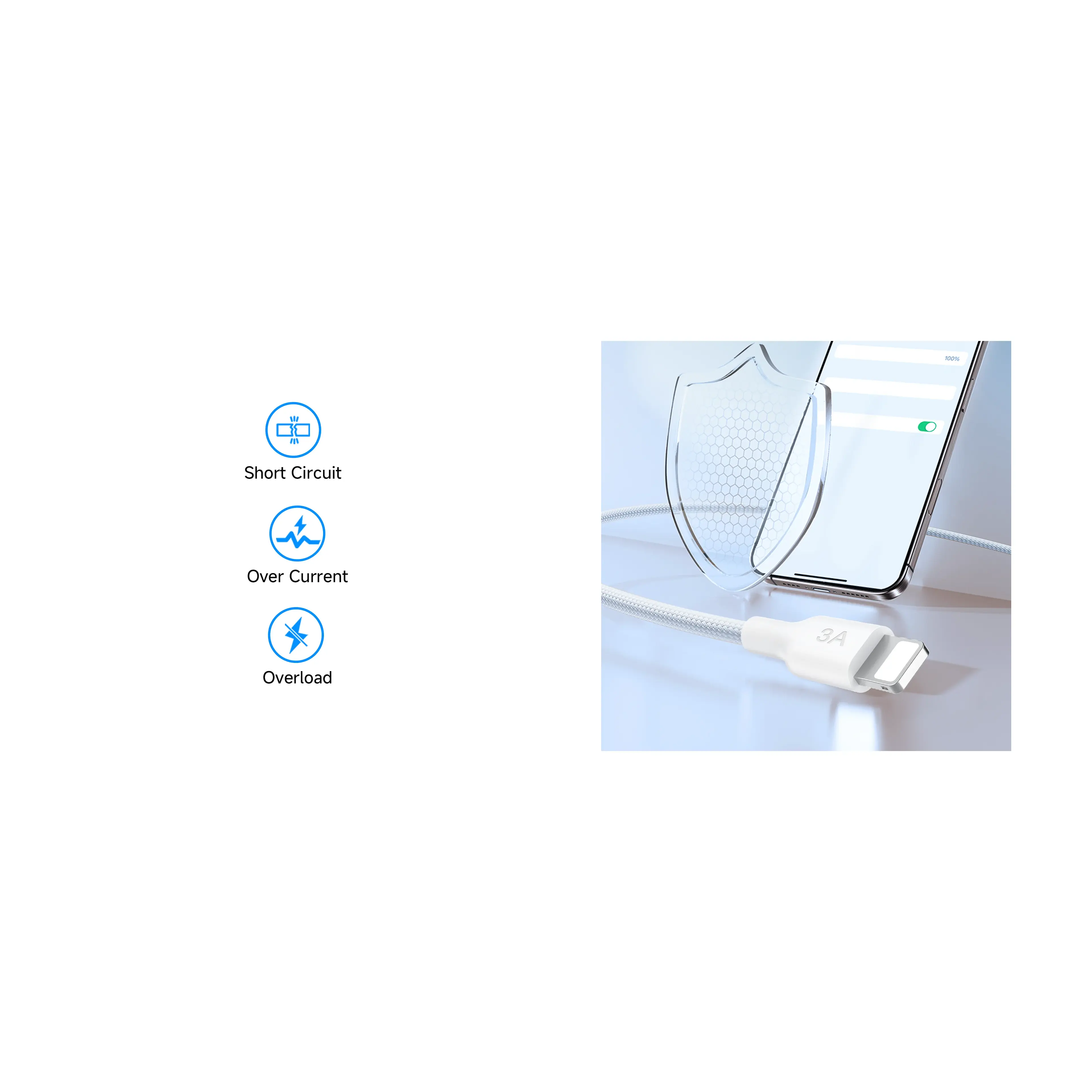 This Lightning charging cable delivers fast and safe 3A charging for iPhone and other Lightning-compatible devices. Built with a durable PET braided exterior and sturdy aluminum connectors, it resists heat, abrasion, and daily wear. An integrated chip ensures safe, stable power delivery.