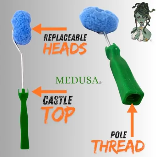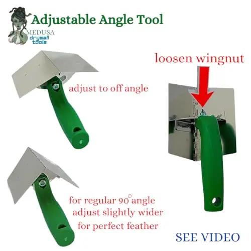 Medusa Adjustable and Reversible S.S. Drywall Angle Tool for Off Angles and Regular 90% Angles. This Tool Enables You to Slightly Change the Angle Degree for a Nice Feather on the Edges Unlike Other Stationary Non-Adjustable Angle Tools. Set Inccluded Angle Taping Roller with Replaceable Heads. See the Instructional Video.