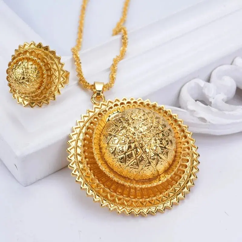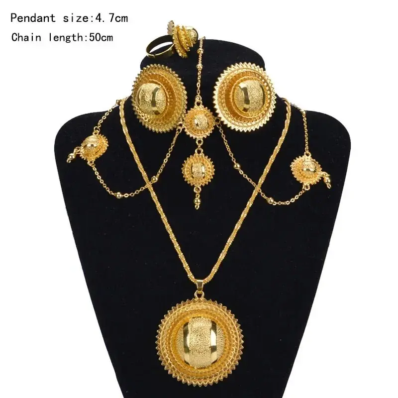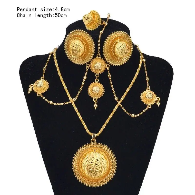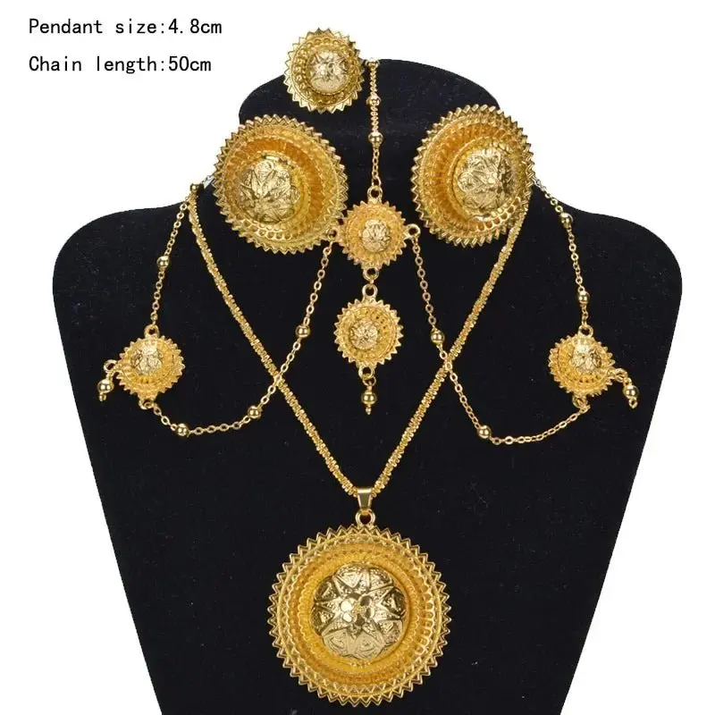 Make your wedding unforgettable with the Aurelia Ethiopian Bridal Jewelry Set. This elegant Habesha-style set includes earrings, necklace, rings, and a headdress, designed to complement traditional Ethiopian attire. Perfect for weddings, cultural celebrations, or special occasions.