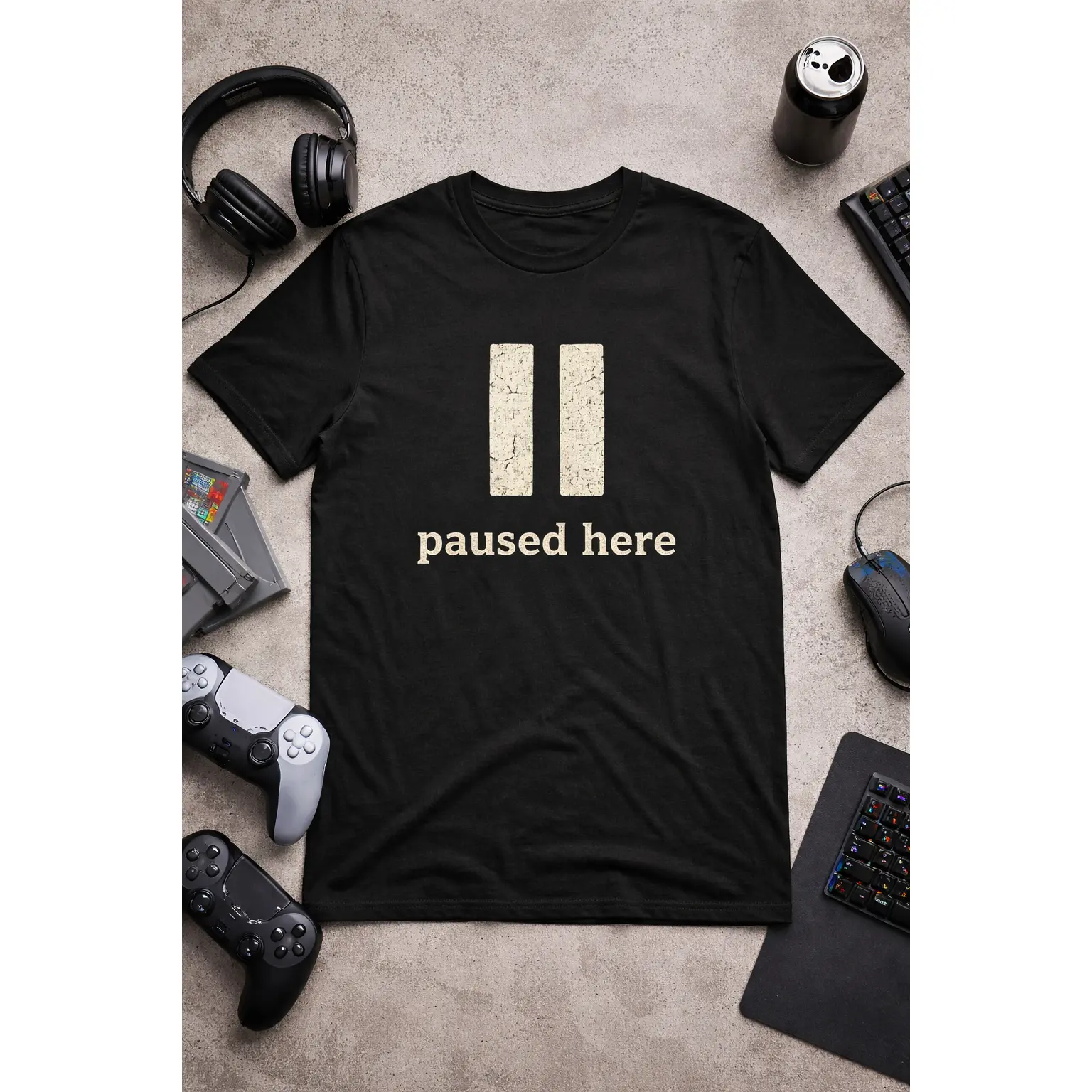 This tee speaks in small, knowing moments. A soft black crew neck with an understated pause symbol and the words “paused here” — it’s for the person who collects quiet seconds in a loud world. Wear it on slow mornings with coffee or layered under a jacket for late-night walks. The muted print and classic fit read casual but thoughtful, a subtle nod to mindfulness and reclaimed downtime. It sits easily in a capsule wardrobe and becomes the go-to for low-key meetups, study sessions, chill commutes, or when you want your mood to speak without shouting.
