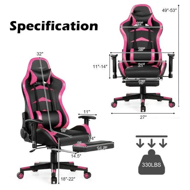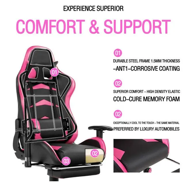 This gaming chair is all designed for your every need! When you playing games; the height and angle of armrest can be adjusted into a perfect position; making a successful competition. After blood-and-thunder gaming time; you can recline backrest angle and pull out the footrest pad to enjoy leisure time with TV or have a deep sleep. Supported by an iron frame and gas rod; it is stable enough to serve for years.