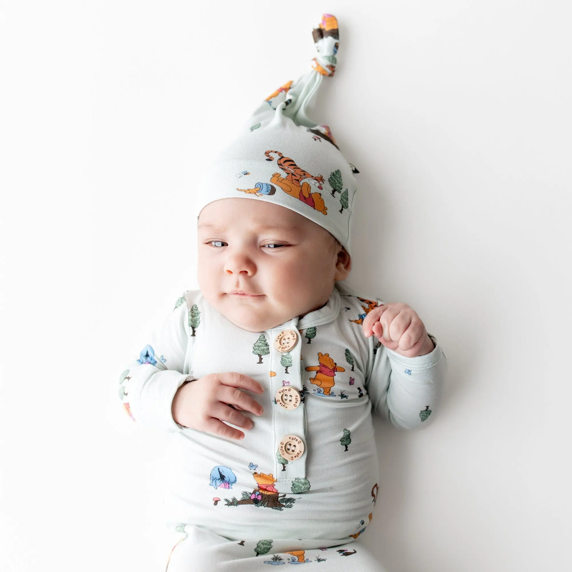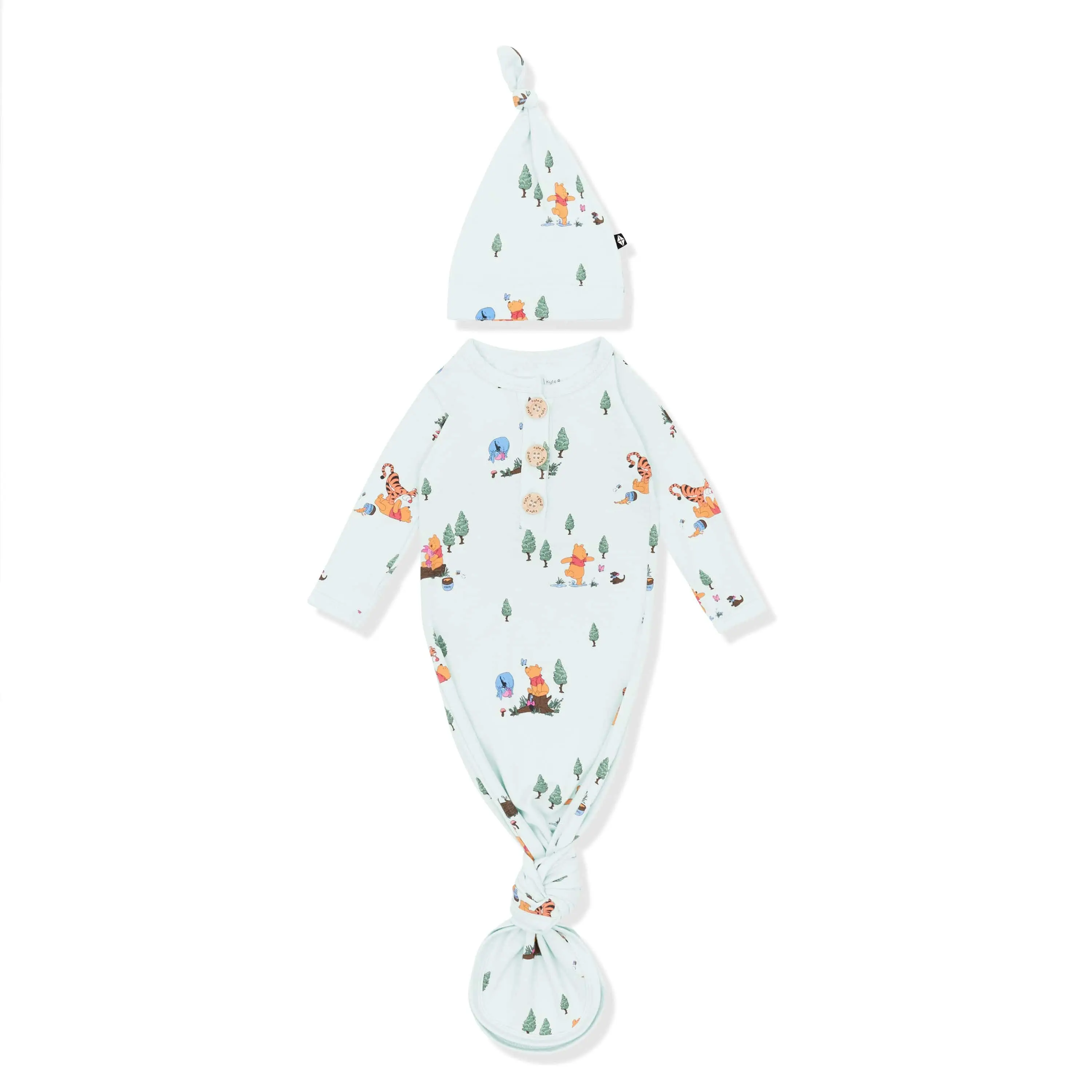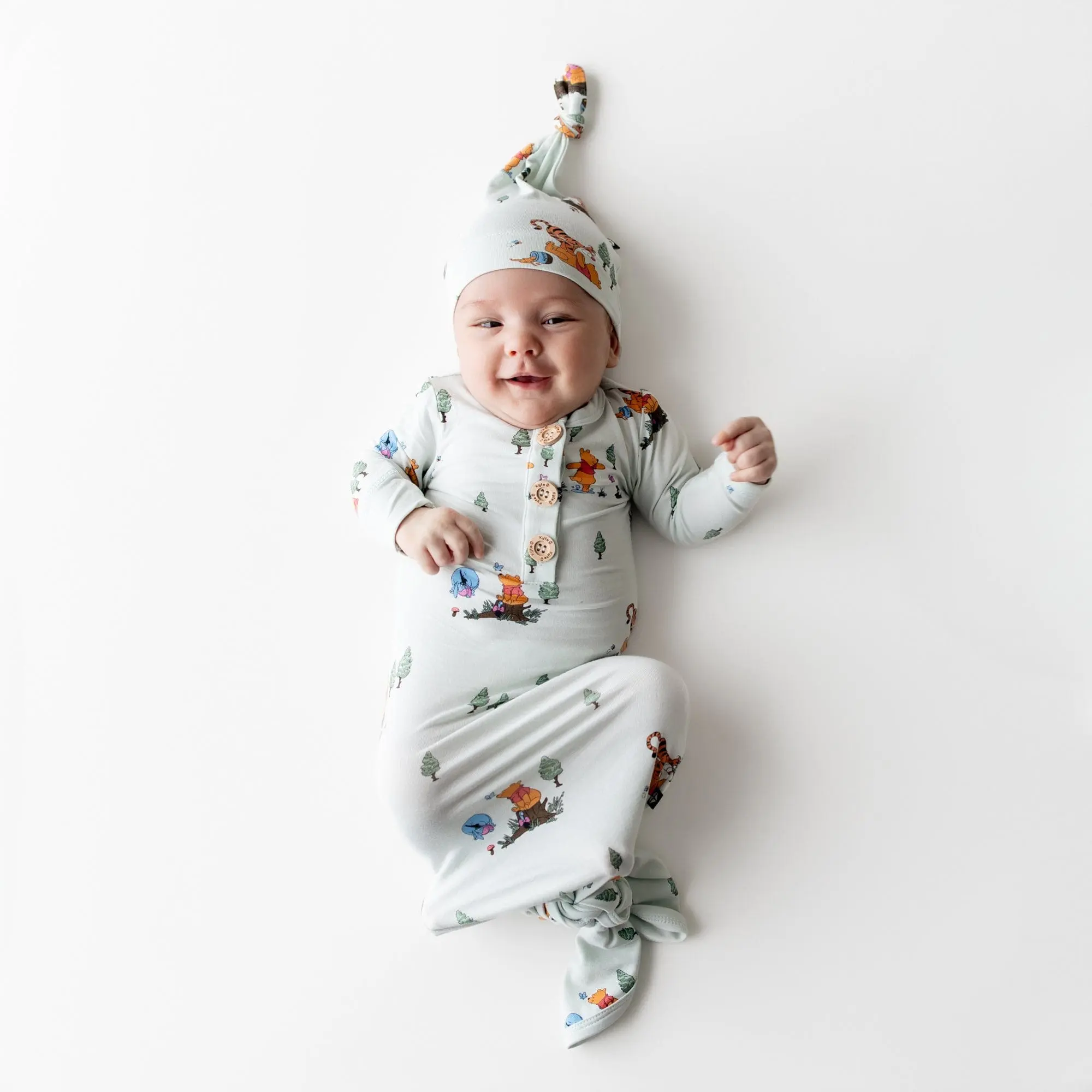 This knotted gown is made from snuggly soft bamboo fabric that’s gentle on your newborn’s delicate skin, and perfectly stretchy for hip-healthy movement. A tie bottom design makes diaper changes a breeze, while wooden buttons on the front add adorable charm. A matching knotted cap is the finishing touch to a picture-perfect look to announce your little one’s arrival.