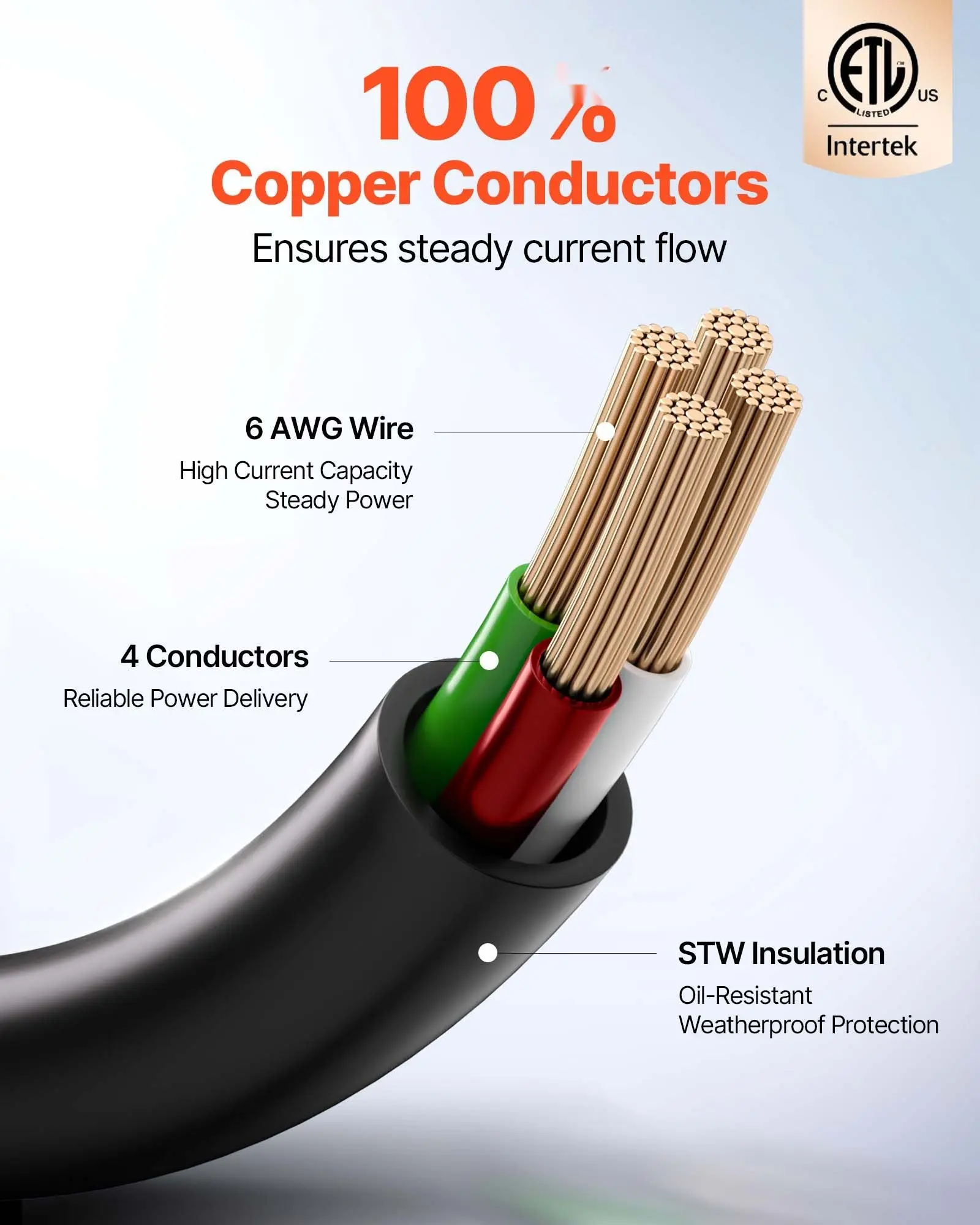 ·50A Pure Copper Wire: Built with premium 6/3 + 8/1 AWG pure copper wire, this 4-prong NEMA 14-50P to NEMA 14-50R cord supports up to 7500W at 125V/250V AC. Designed for high-power RV appliances and reliable power transfer on the road