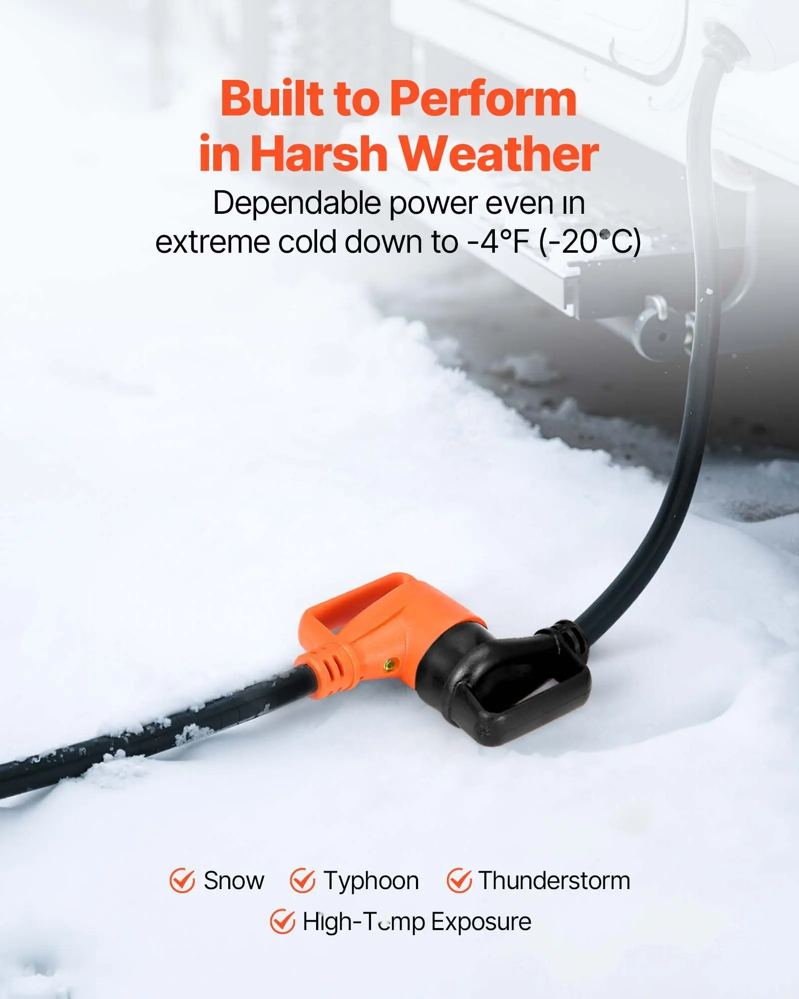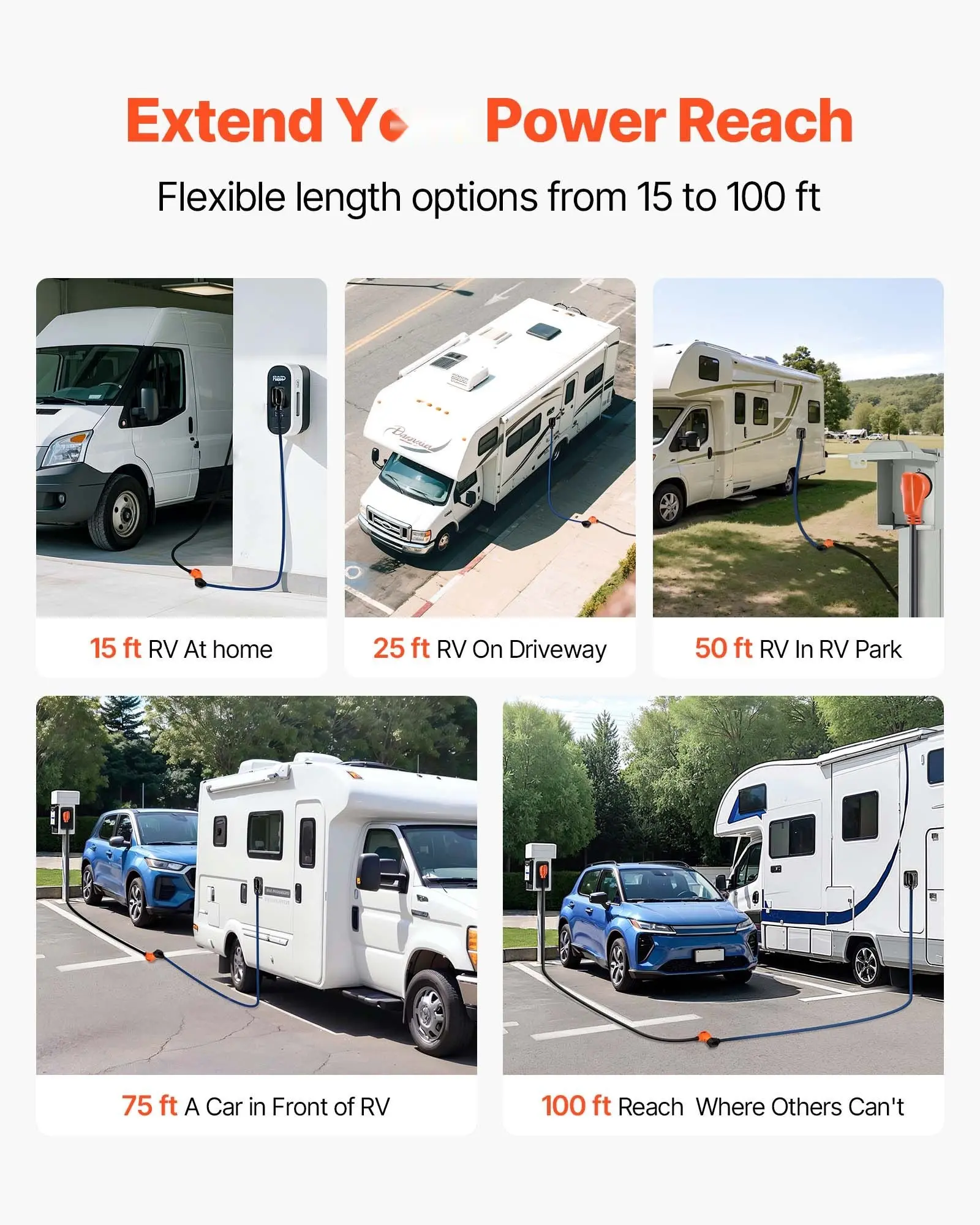 ·75 ft Heavy-Duty Extension Cord: Ideal for long-distance setups, ensuring your RV stays powered up even when the outlet is far away. (Note: Power loss occurs for cords over 50 ft, 50A may drop to 40A due to increased resistance)