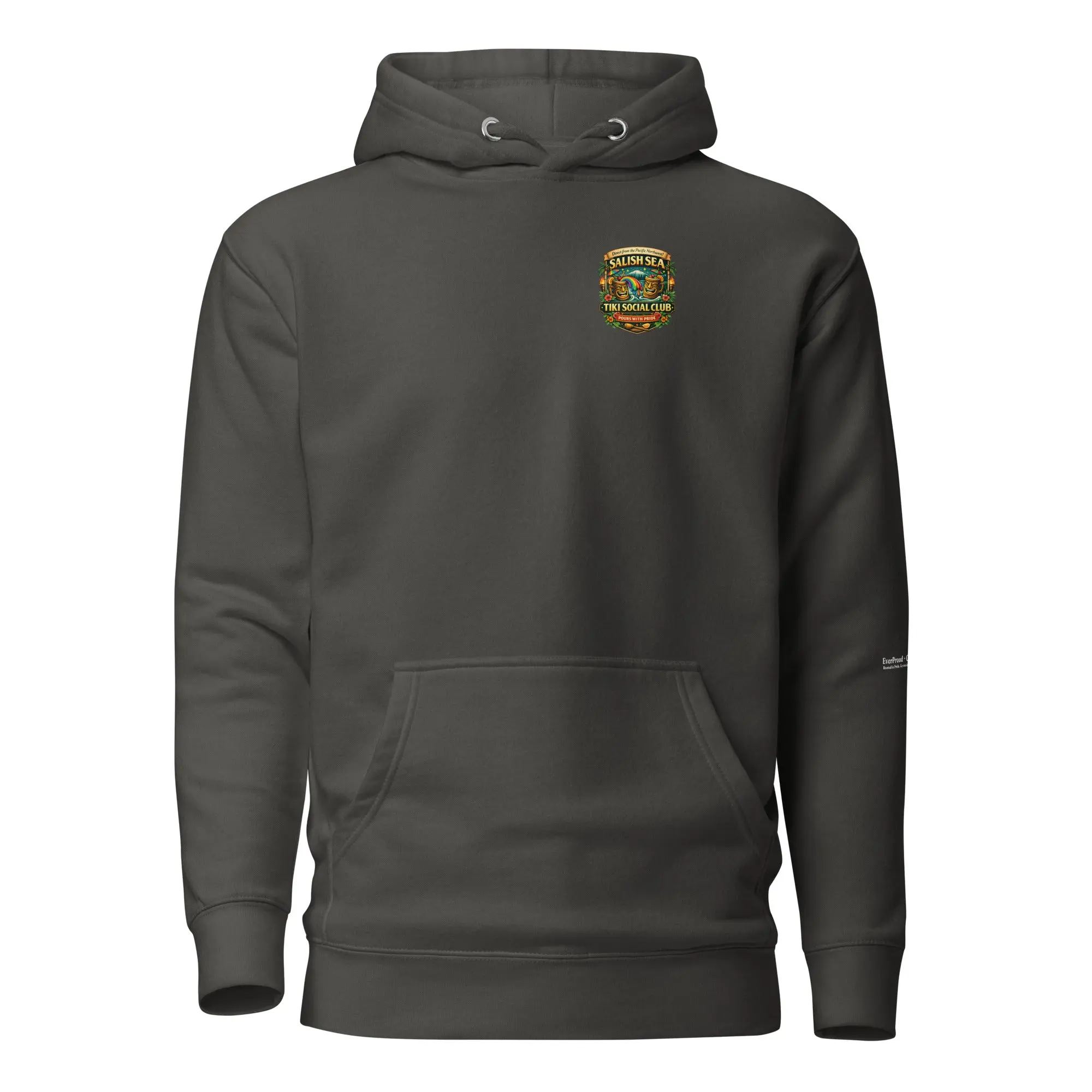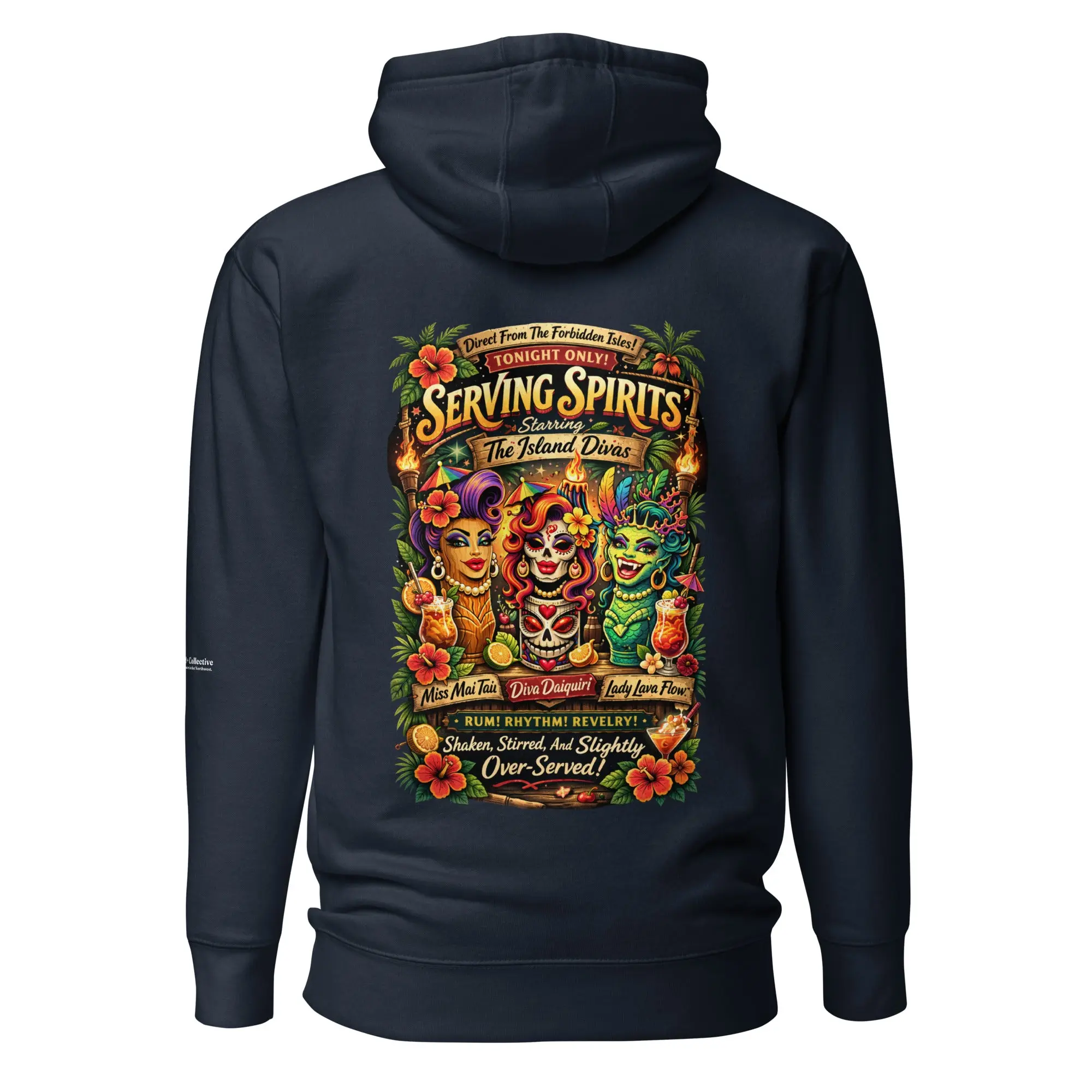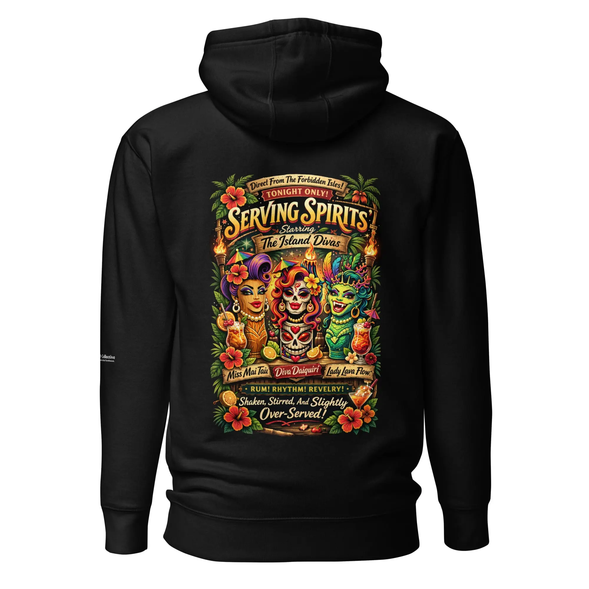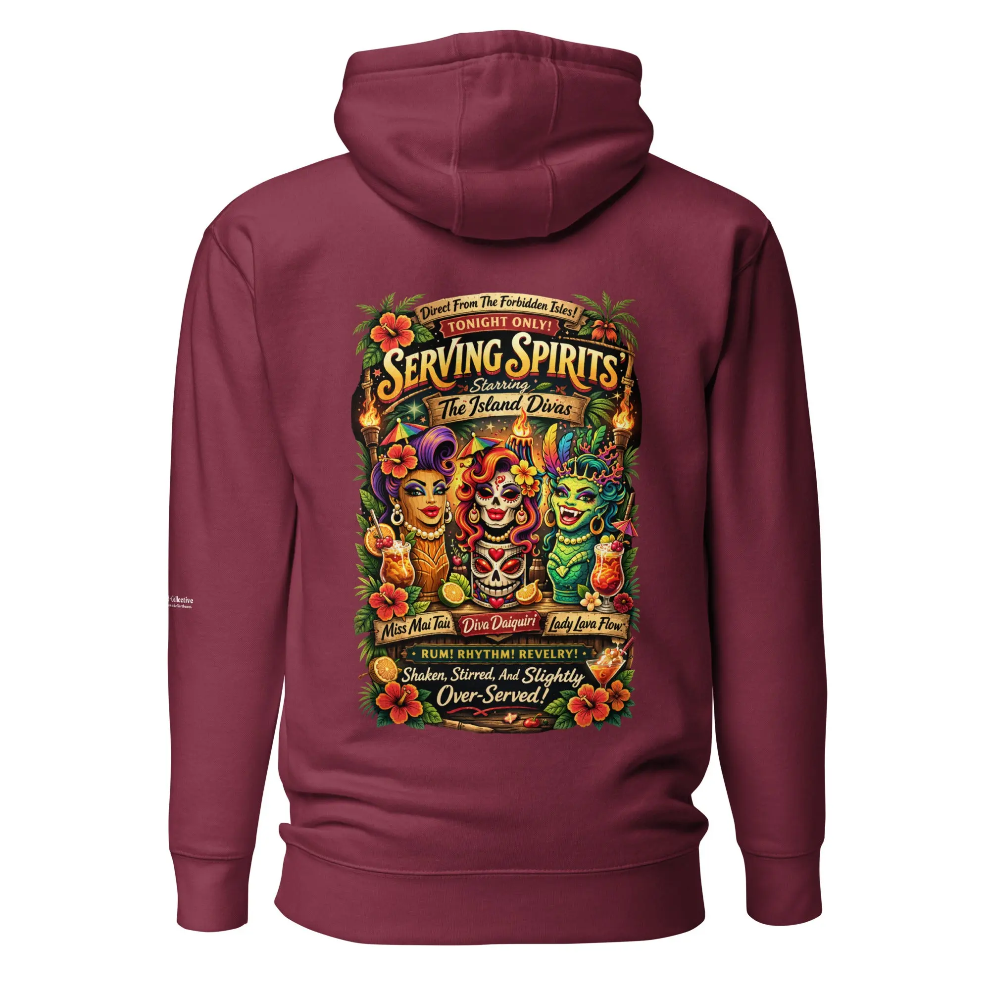 Serving Spirits is a bold, theatrical hoodie inspired by vintage tiki lounge posters, tropical showbiz, and playful camp energy. Part of the Salish Sea Social Club collection from EverProud Collective, this design blends island glamour, retro cocktail culture, and a wink of pride into a cozy statement piece made for cooler days and standout style.