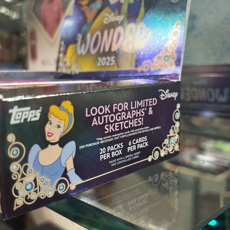 Two packs of 2025 Topps Disney wonder trading cards. Look for limited autographs and sketches.