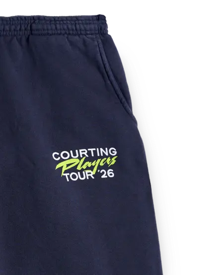Distressed graphics nod to classic tennis culture. Each pair is cut, sewn, and screen-printed in Los Angeles, making every piece one of a kind. With wear, the print softens, cracks, and ages into the lived-in tennis look we love.