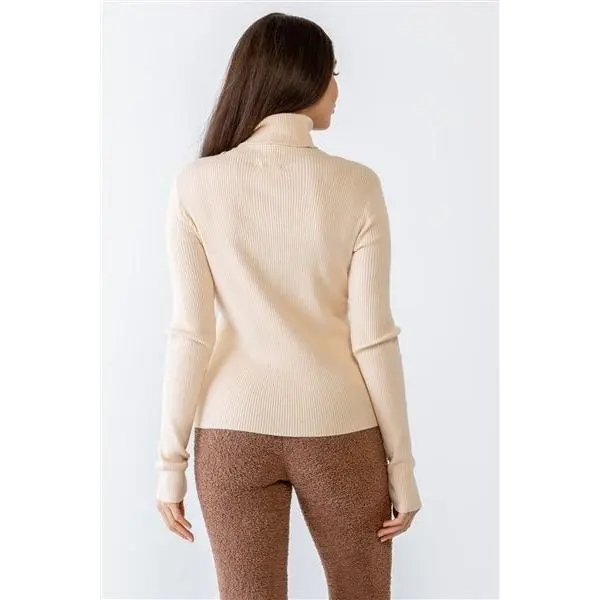 Women’s beige ribbed turtleneck sweater with a front‑slit hem and fitted design, ideal for chic fall and winter outfits.
