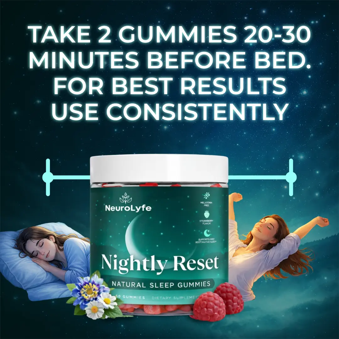 Recent studies show long term melatonin use has actually been linked to heart failure. So we set out to make the healthiest and most effective sleep aid on the market. NeuroLyfe Nightly Reset Gummies are designed to aid in achieving a restful night's sleep, WITHOUT melatonin- only natural ingredients. These gummies are crafted to help you fall asleep faster, sleep deeper throughout the night, and wake up more energized. Each gummy is infused with ingredients that promote relaxation and calmness, ensuring you wake up feeling refreshed.