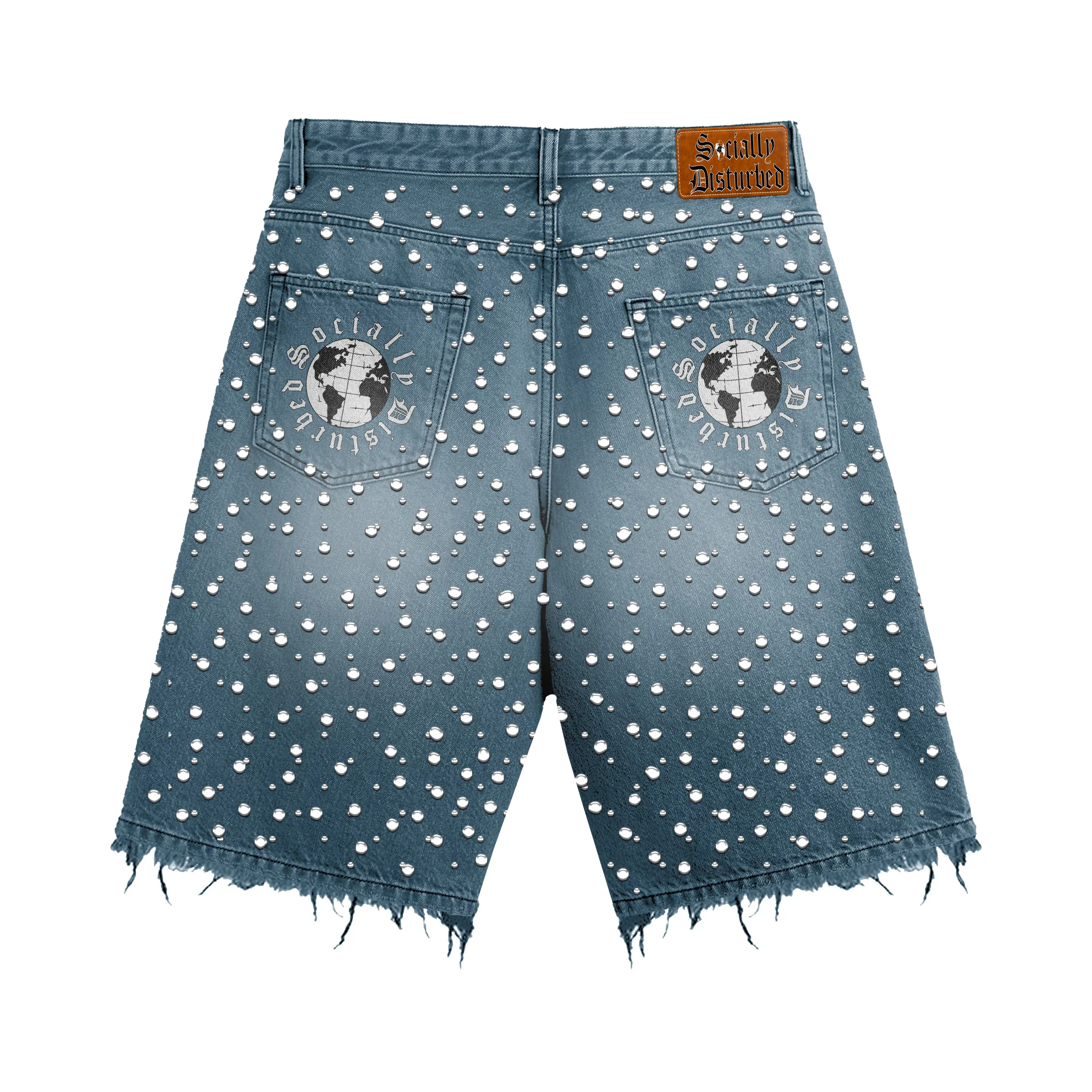 Step into bold luxury with our Socially Disturbed Rhinestone Jorts, crafted from premium denim for a perfect balance of durability and comfort. Designed for those who refuse to blend in, these statement shorts combine raw street influence with high-end detail. The light-wash base is elevated with a custom splatter effect, while the right leg features our iconic "Socially Disturbed" emblem fully iced out in rhinestones for a standout finish.
