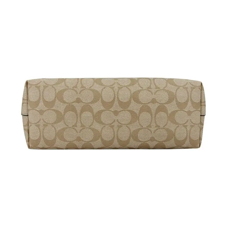 Design Concept: Inspired by urban practicality and classic elegance, this tote features a clean silhouette, secure zip closure, and COACH’s iconic brown “Pebble Grain”-inspired print on durable white PVC—a contemporary reinterpretation of the brand’s archival motifs.